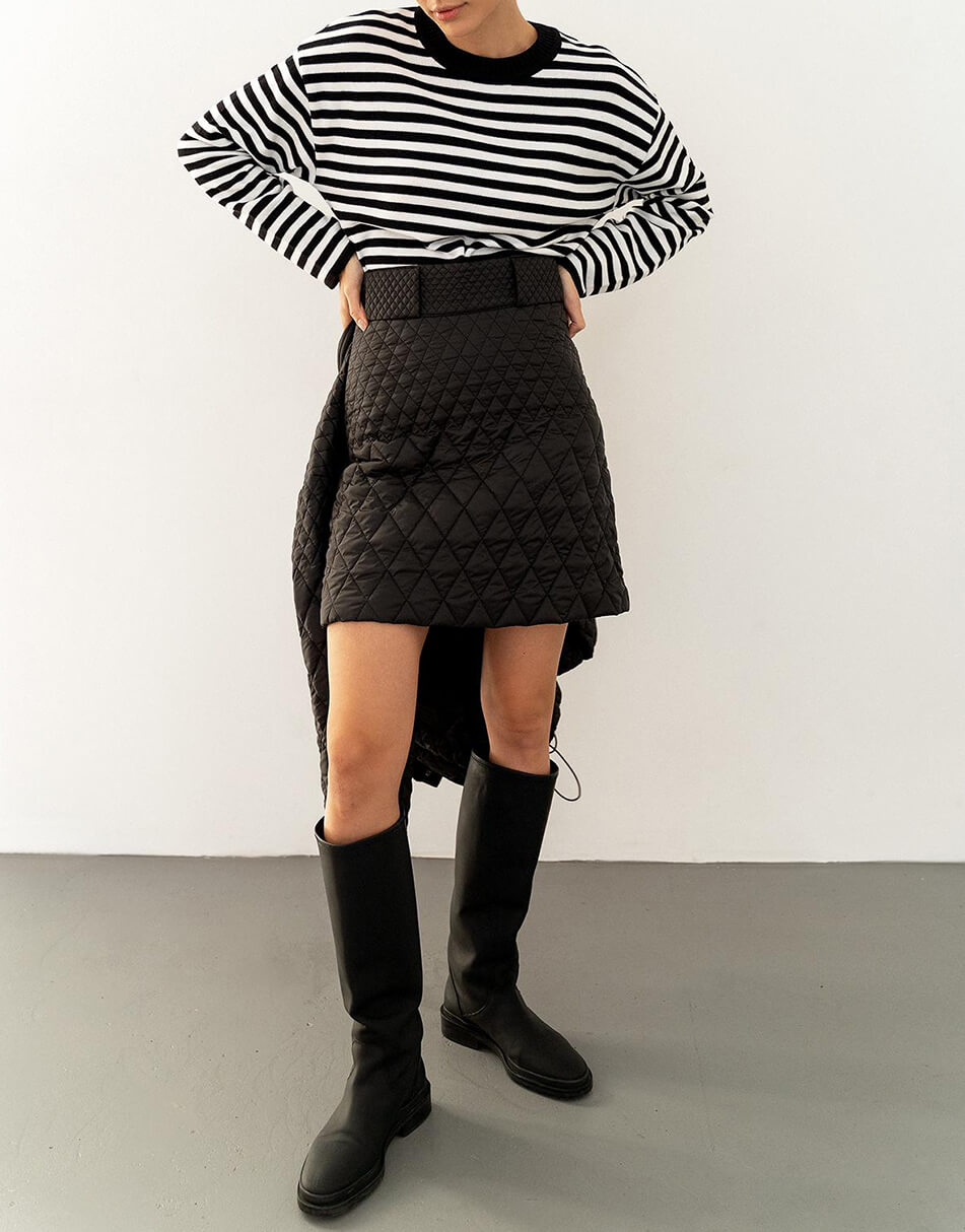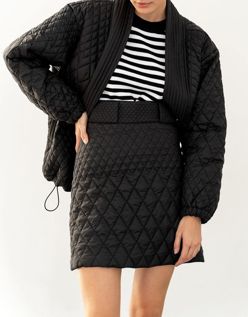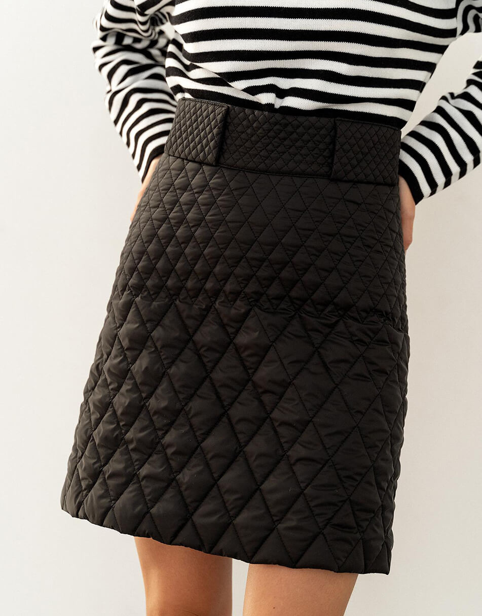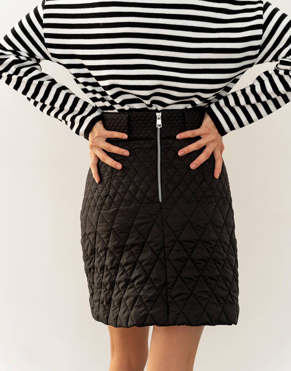 Стьобана спідниця, виконана в технології двостороннього стьобання, що надає виробу особливої легкості, практичності та бездоганного дизайну. Температурний режим до – 5 градусів. Утеплювач: синтепух 150. Спідниця з високою лінією талії, застібається ззаду на декоративну блискавку.