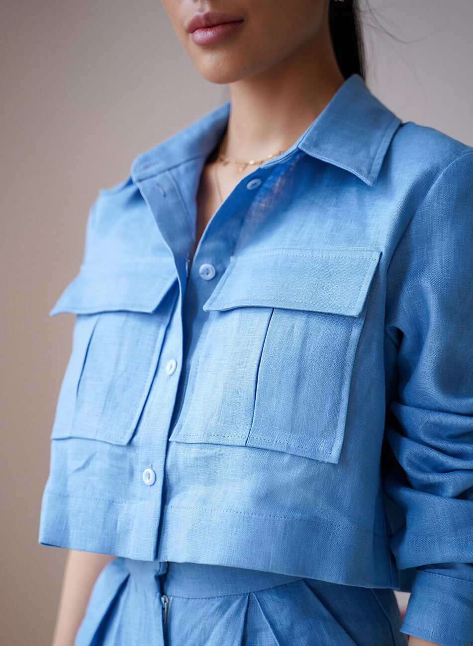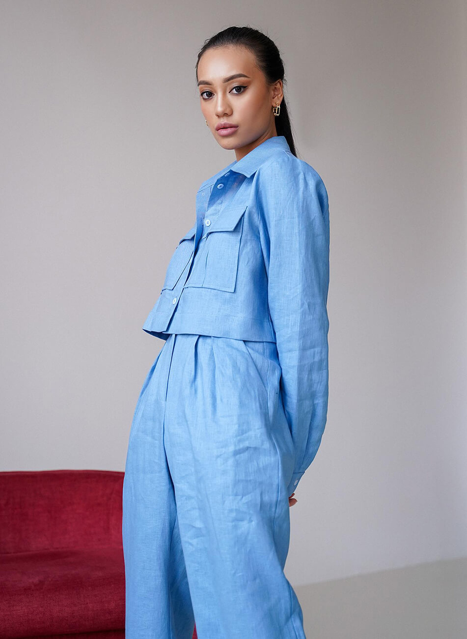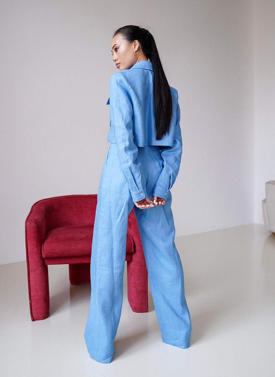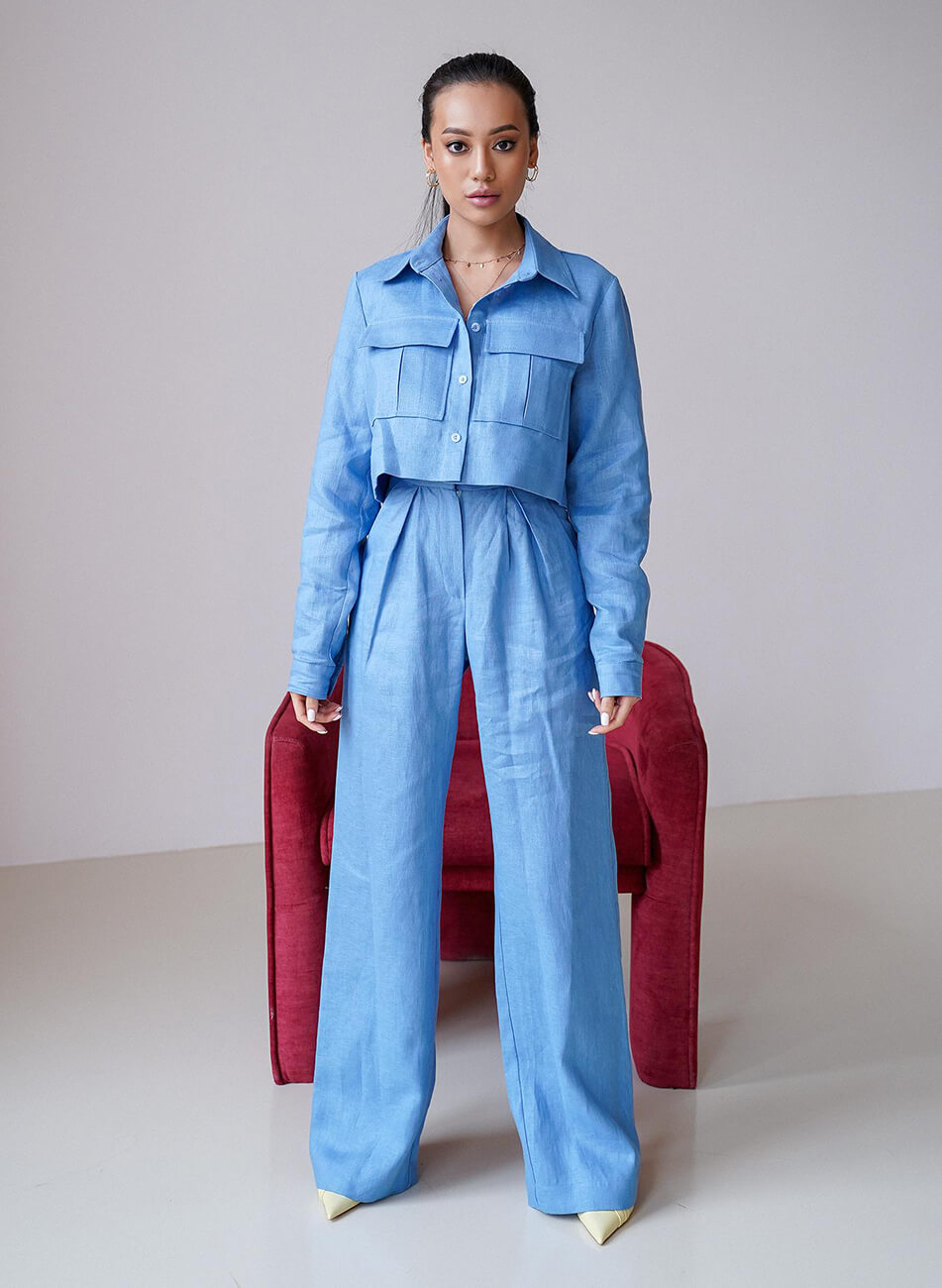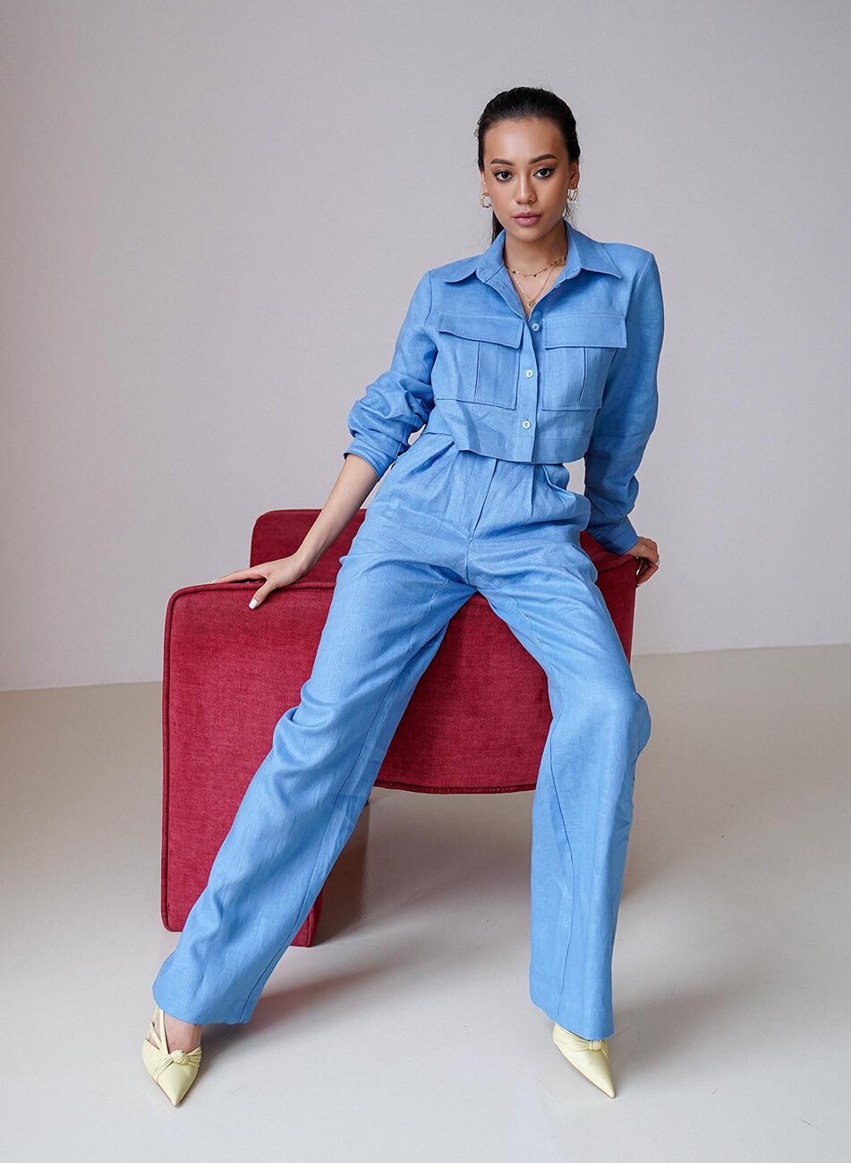 Лляний, яскравий костюм. Об’ємна, укорочена сорочка з накладними кишенями. Штани із завищеною талією, розкльошеного крою, застібаються на потаємну блискавку і гачок. Костюм ідеально поєднується як із взуттям на підборах, так і на плоскій підошві.
