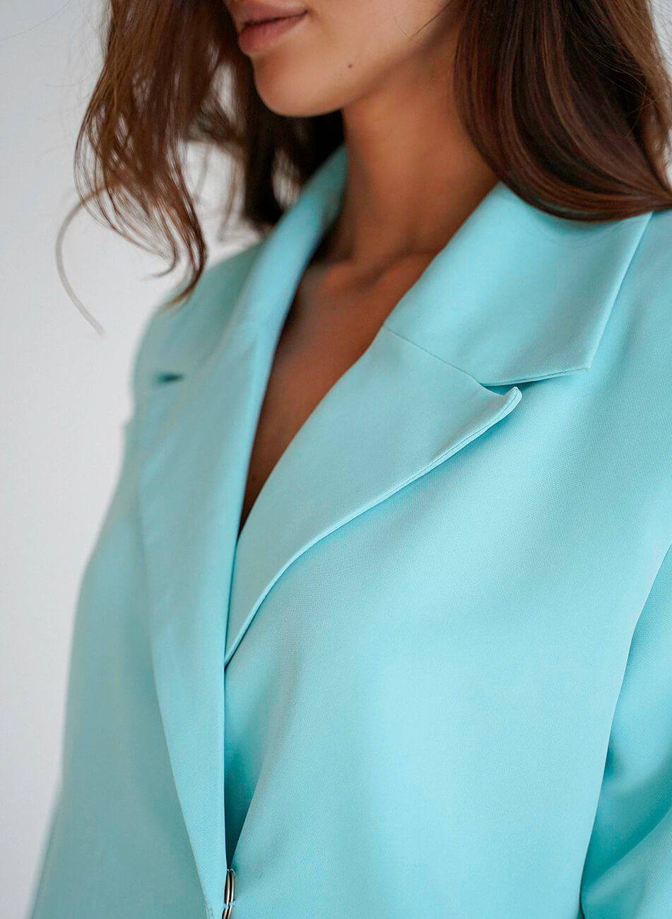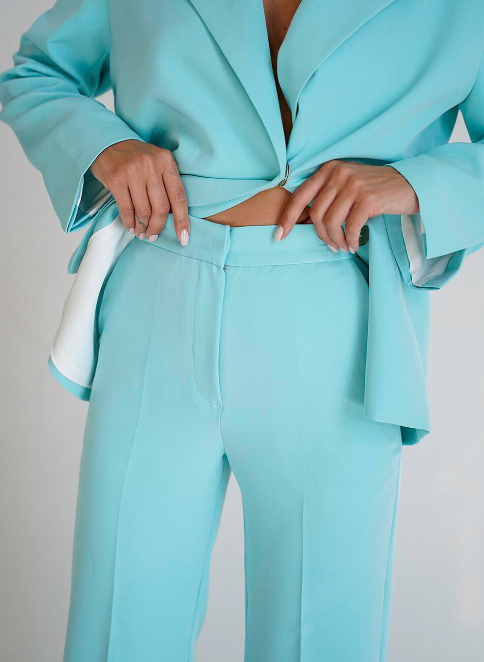 Розкішний костюм із м’якої, літньої тканини. Подовжений двобортний піджак прямого крою повністю на підкладці. Штани із завищеною талією, розкльошеного крою, застібаються на потаємну блискавку та гачок. Костюм ідеально поєднується як із взуттям на підборах, так і на плоскій підошві.