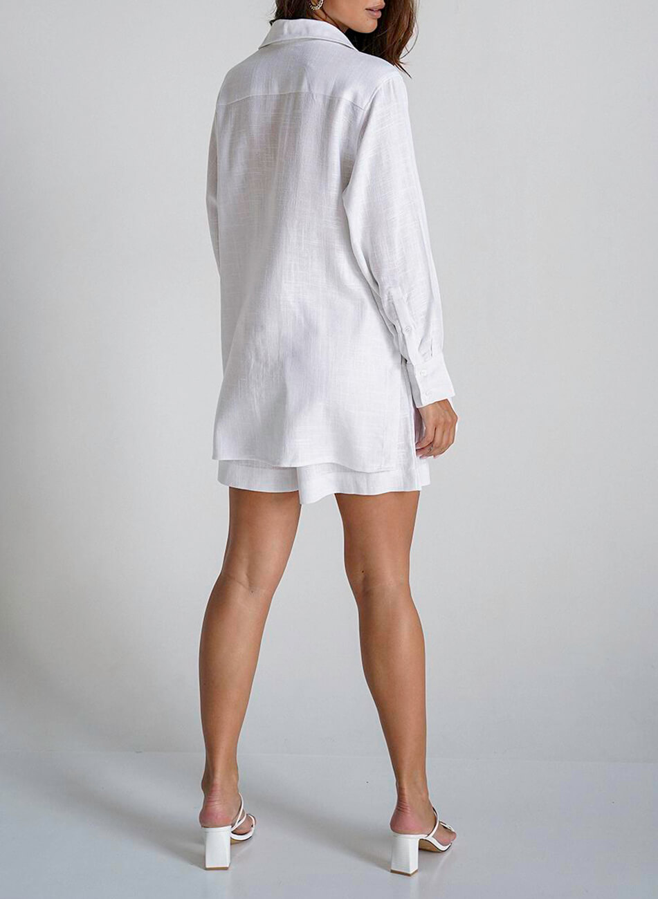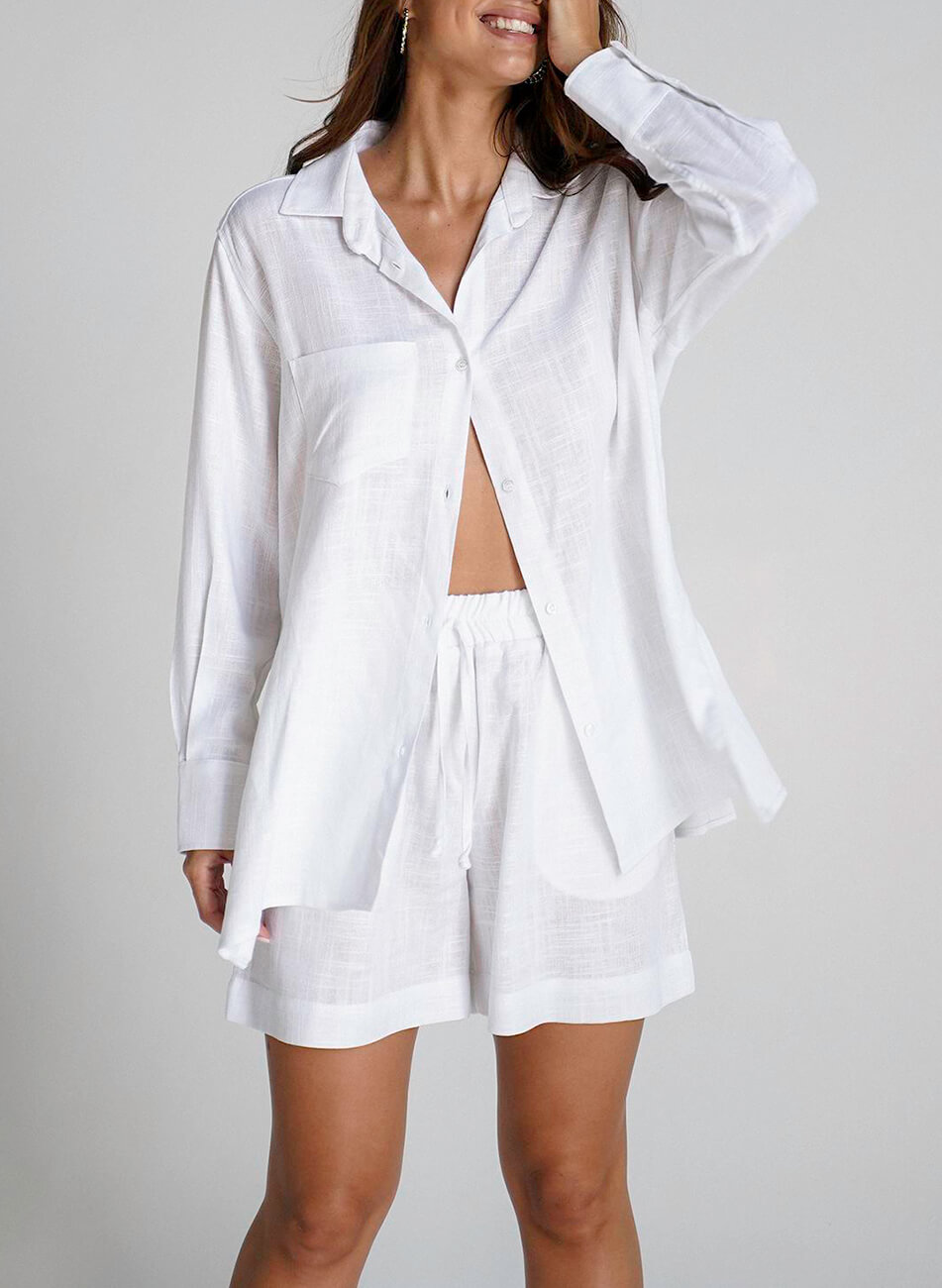 Зручний лляний костюм: подовжена оверсайз сорочка, ніби з чоловічого плеча, та об’ємні шорти з високою лінією талії, вільного крою, трохи розширені до низу та кишенями з боків. Костюм стане прекрасним компаньйоном у відпустці.