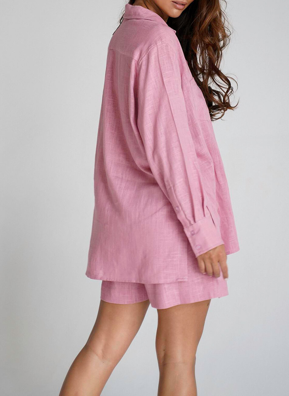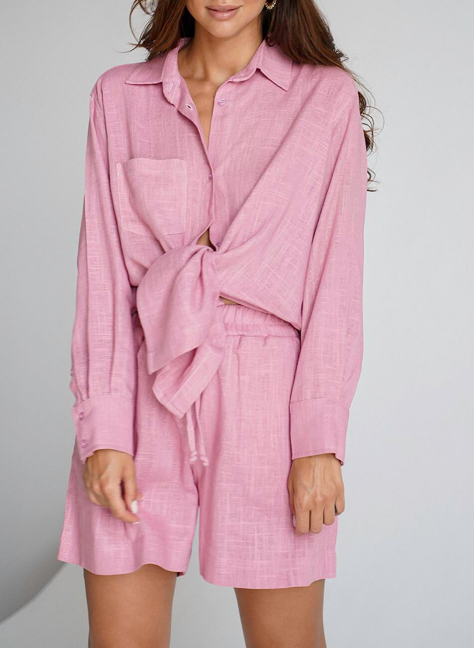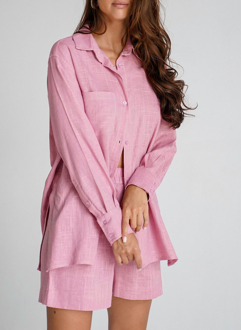 Зручний лляний костюм: подовжена оверсайз сорочка, ніби з чоловічого плеча, та об’ємні шорти з високою лінією талії, вільного крою, трохи розширені до низу та кишенями з боків. Костюм стане прекрасним компаньйоном у відпустці.