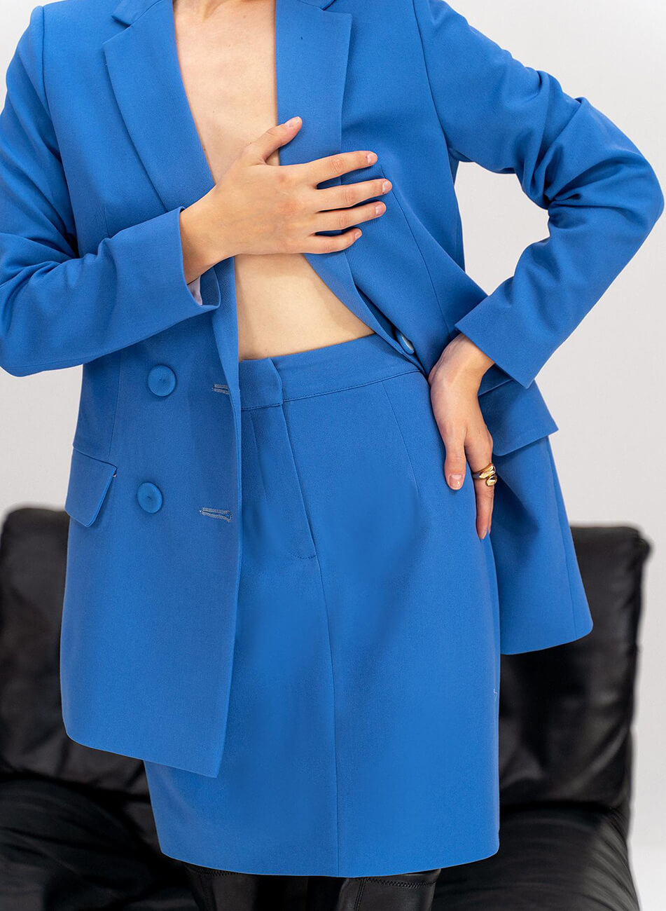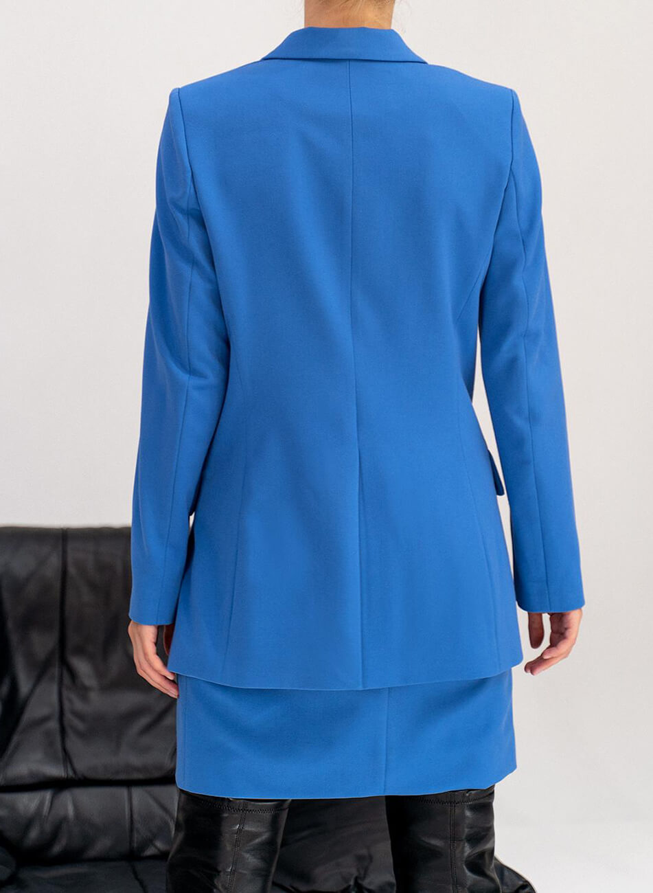 Костюм з піджаком і спідницею. Силуетний, подовжений пиджак двобортного крою. Щільна тканина прекрасно тримає форму виробу. Оригінальний крій, функціональні кишені. Пиджак виконано на підкладці. Довжина виробу 70 см. Спідниця-міні з високою лінією талії. Виконана на підкладці, застібається спереду на молнію і гачок.