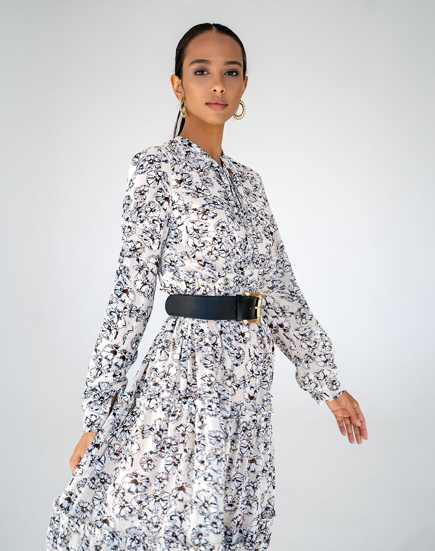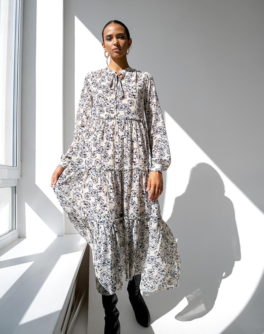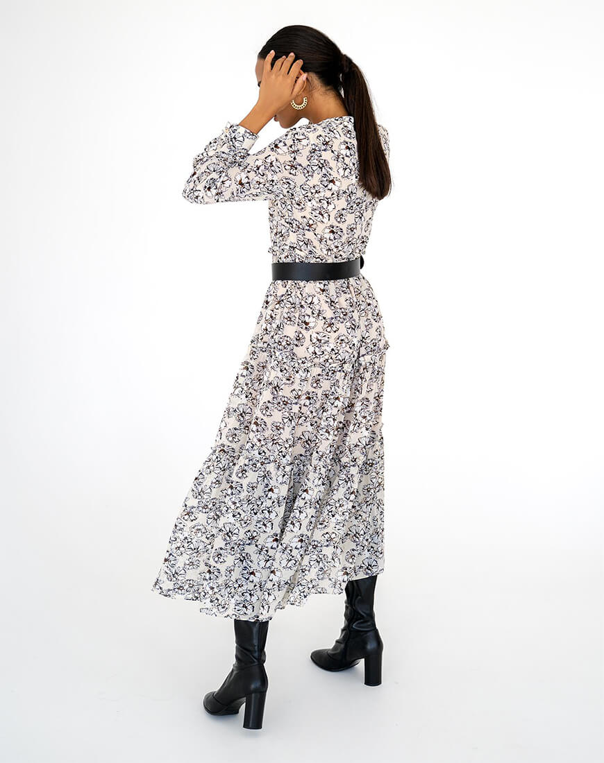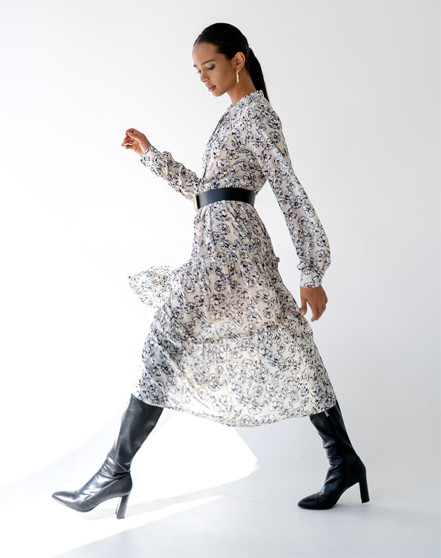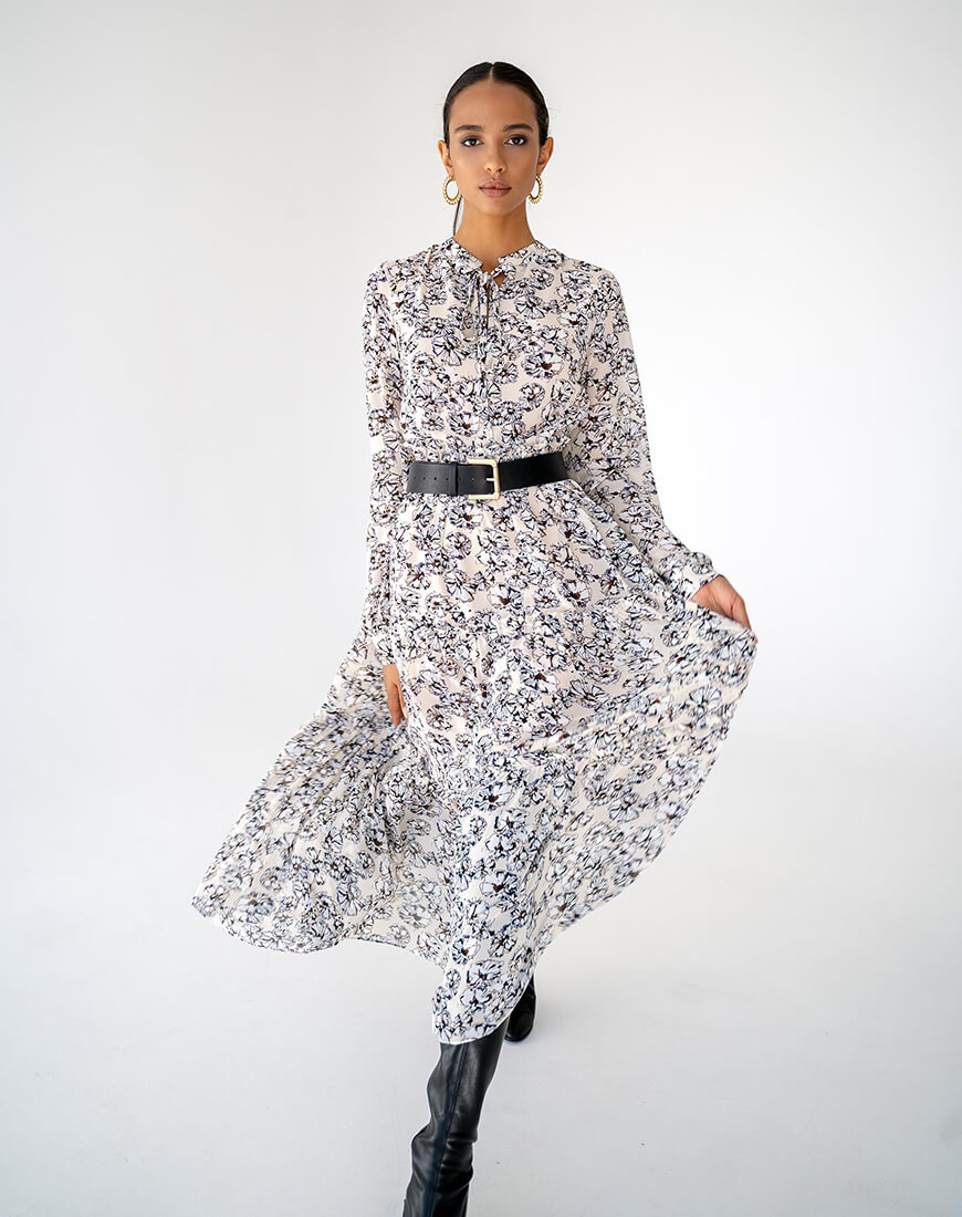 Сукня об’ємного крою, виконана з шифону, на підкладці. Застібається збоку на потаємну блискавку.