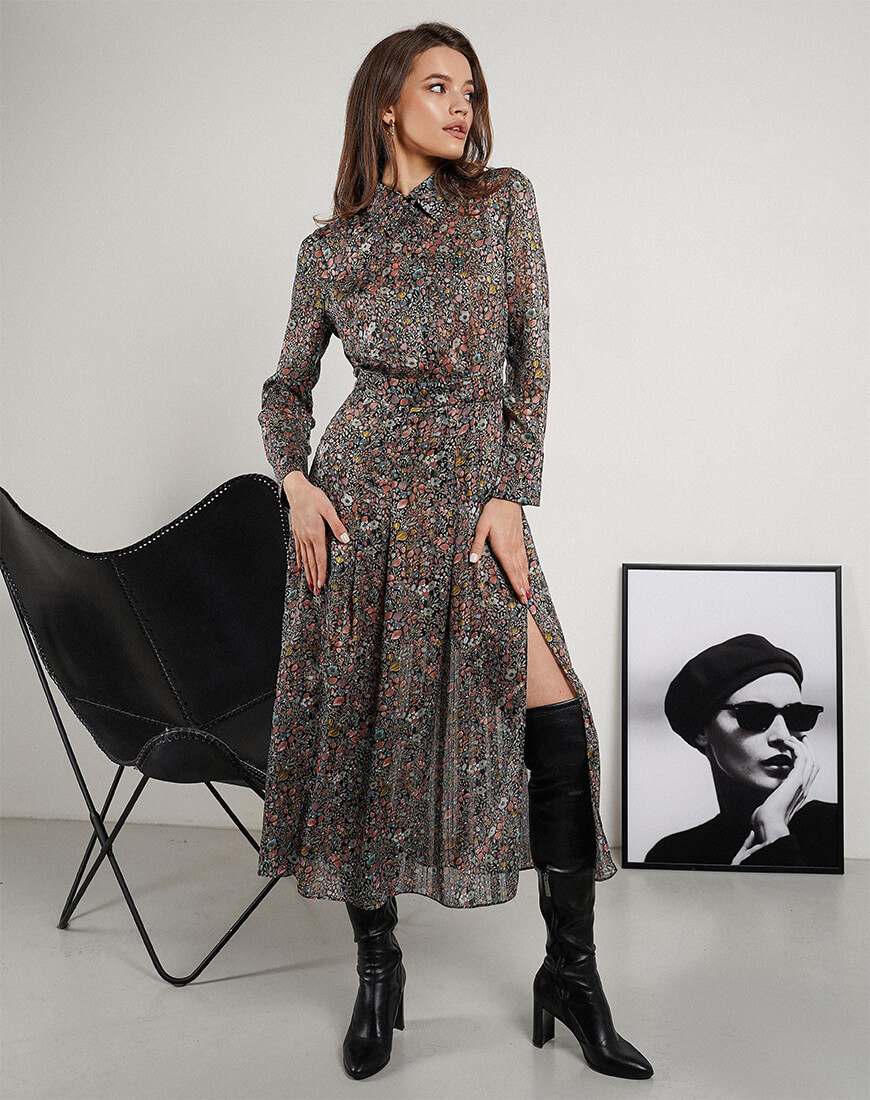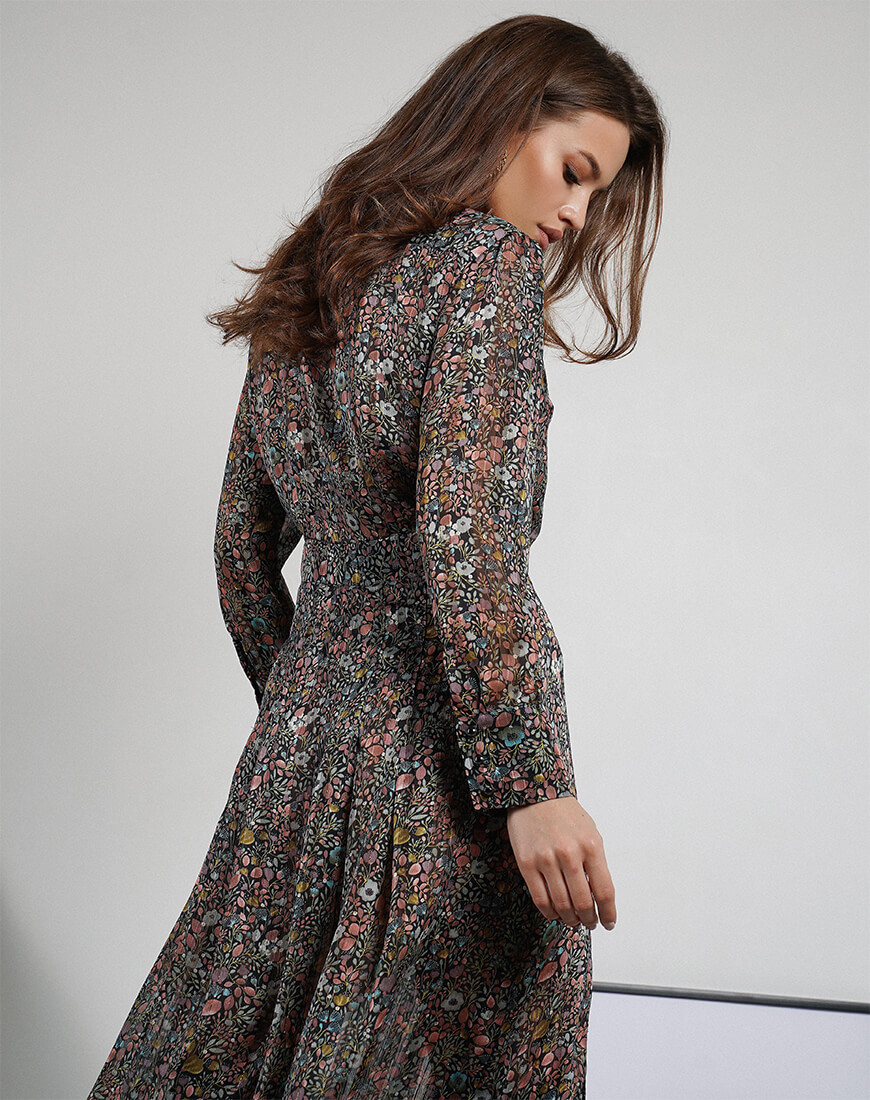 Легка, шифонова сукня з оригінальним принте. Подовжена спідниця з розрізами та легка тканина створюють неймовірно струмливий силует. Сукня застібається збоку на потаємну блискавку. Також, спереду сукня застібається на декоративні ґудзики.