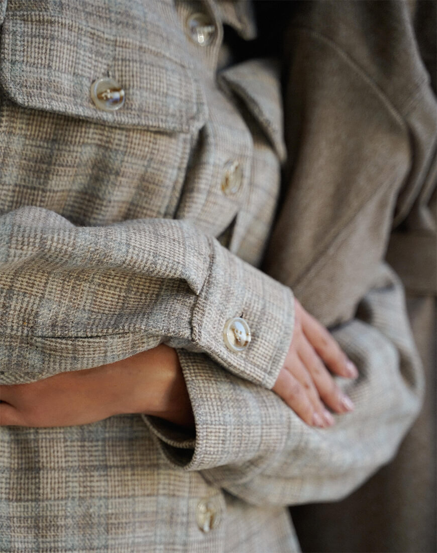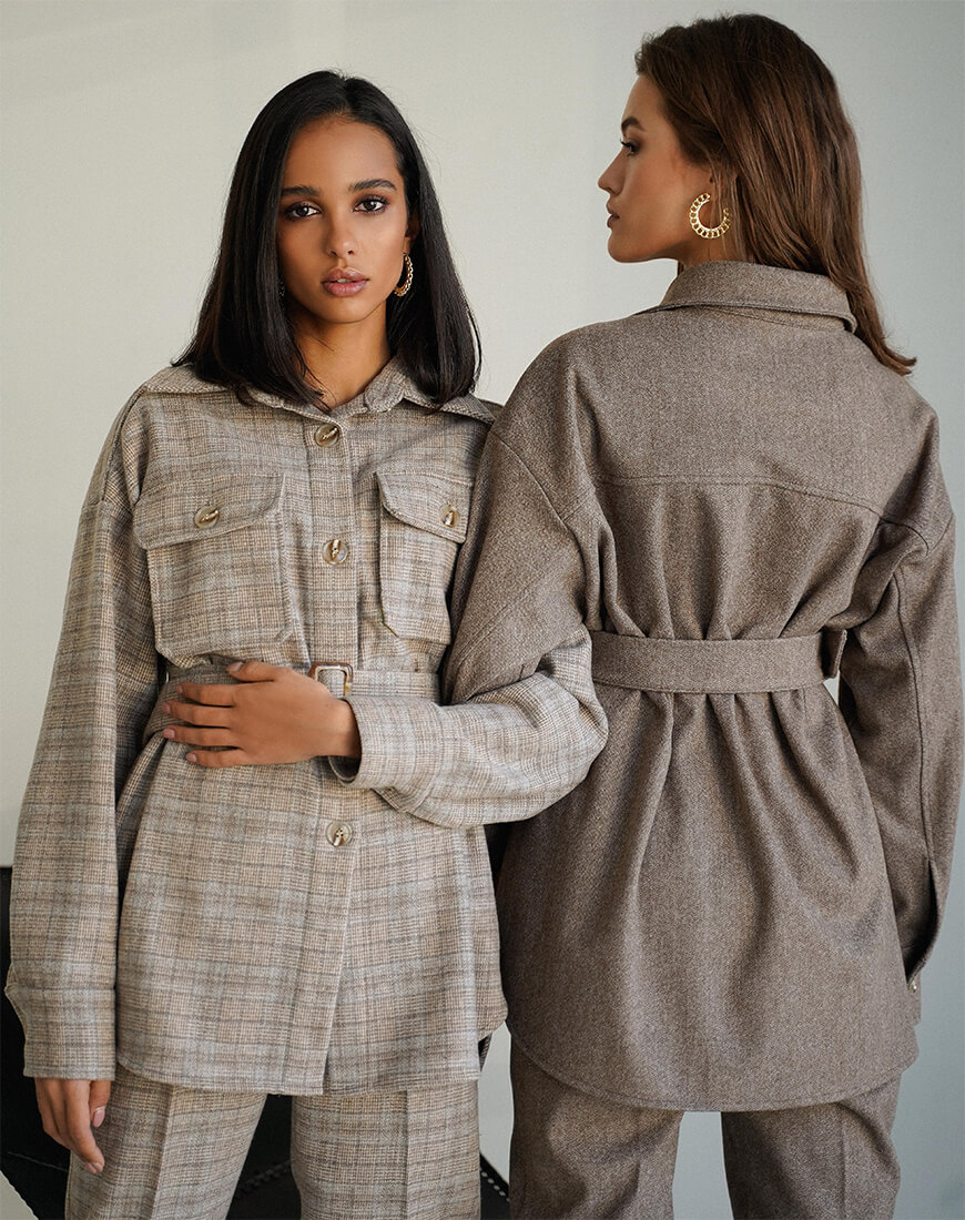 Зручний, м’який костюм із вовни на трикотажній основі. Тканина дуже м’яка і приємна на дотик. Штани з високою посадкою. Кишені з боків. Об’ємна сорочка застібається спереду на декоративні ґудзики. Костюм дуже теплий і зручний.