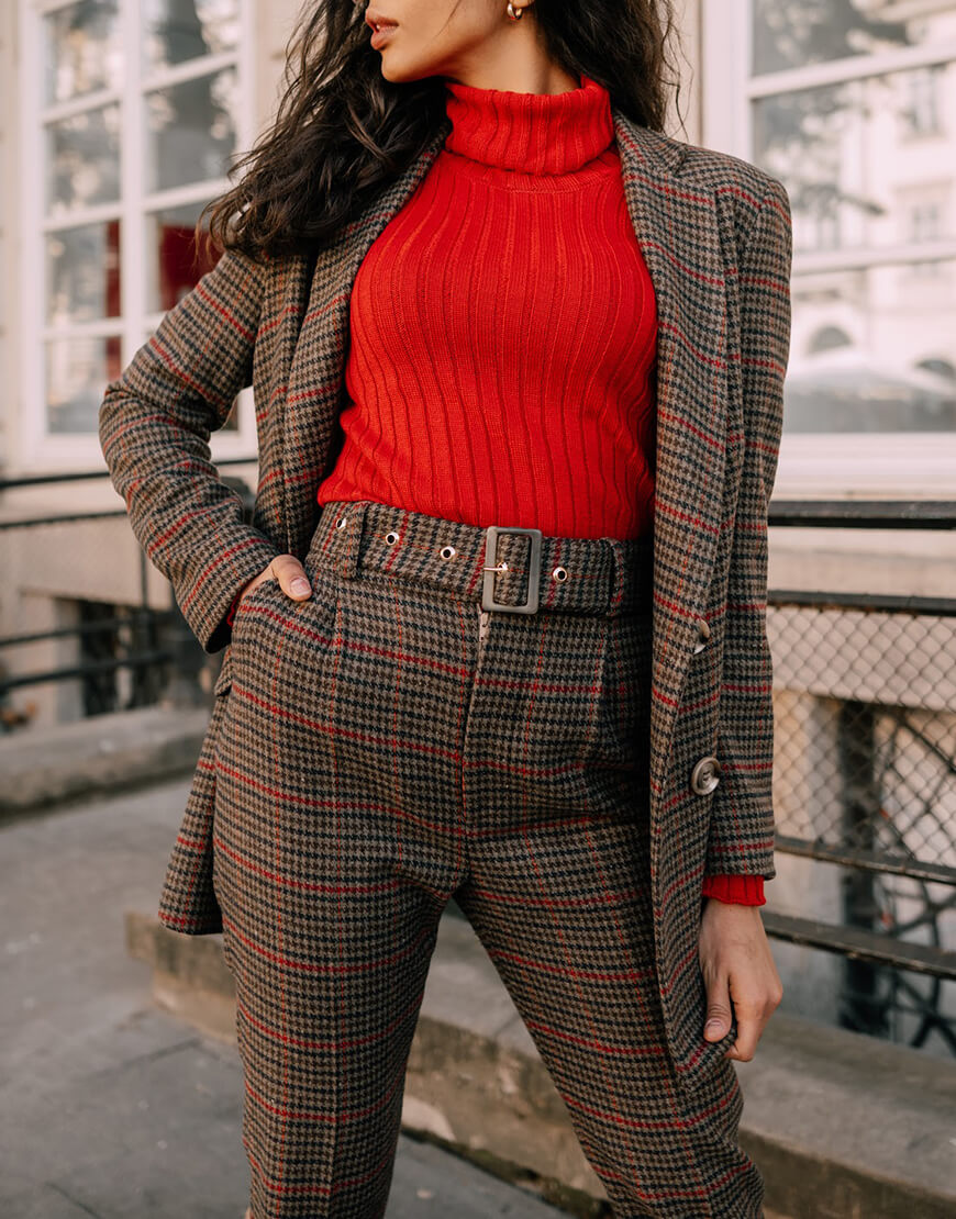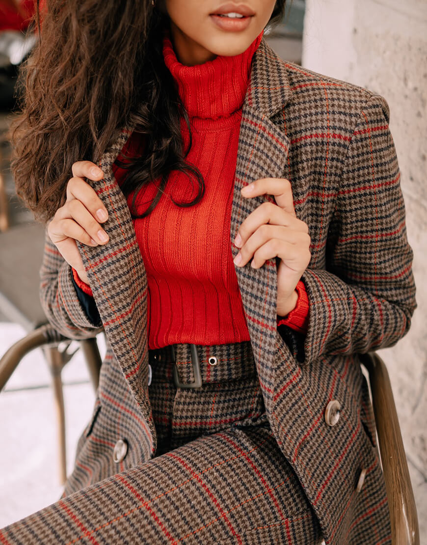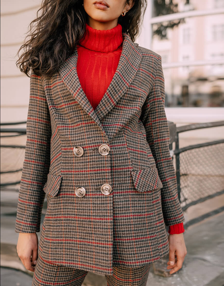 Розкішний костюм з м’якої, теплої вовняної тканини. Двобортний піджак прямого крою повністю на віскозній підкладці. Штани із завищеною талією, прямого крою, застібаються на потаємну блискавку і гачок. Костюм ідеально поєднується як із взуттям на підборах, так і на плоскій підошві.