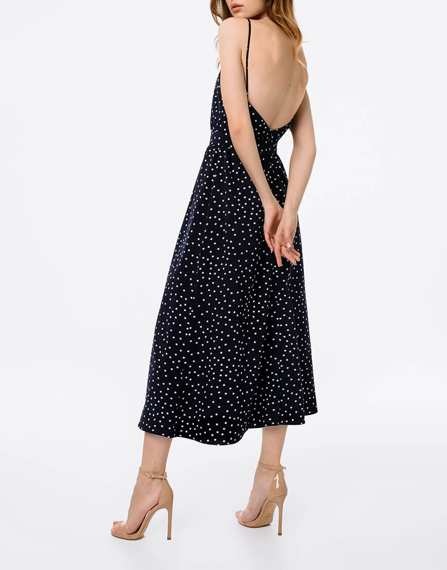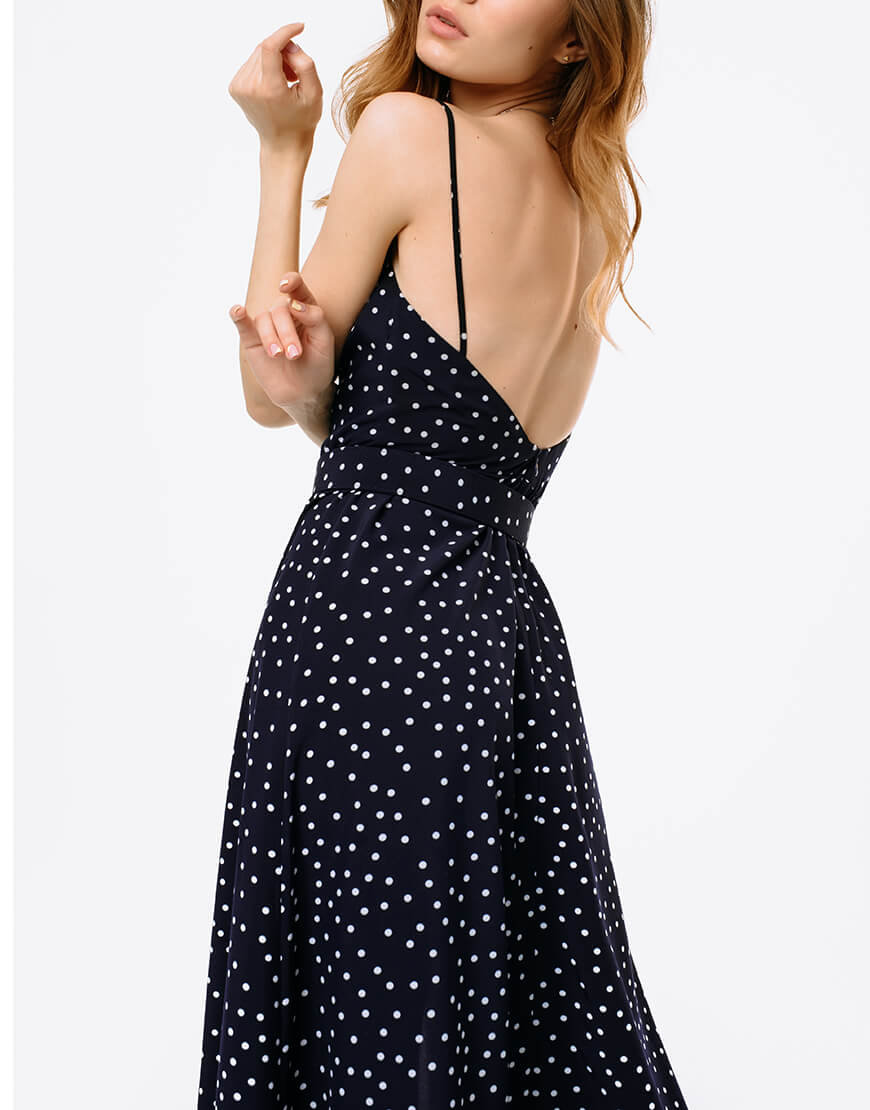 Летюча сукня з розрізом, на тонких бретелях, з відкритою спинкою, декорована ременем. Виконано з матеріалу soft в принт “polka dot”: дихаючий матеріал ідеально підходить для спекотного літа. Підійде для повсякденних і вечірніх образів.