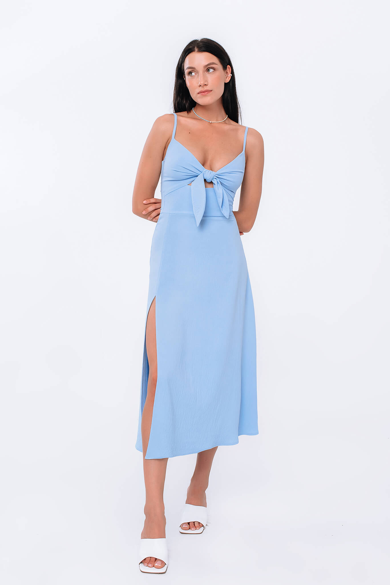 Доставка впродовж 2-5 робочих днівЕлегантна сукня на бретелях із зав’язкою на грудях.Спідниця вільного крою з розрізом