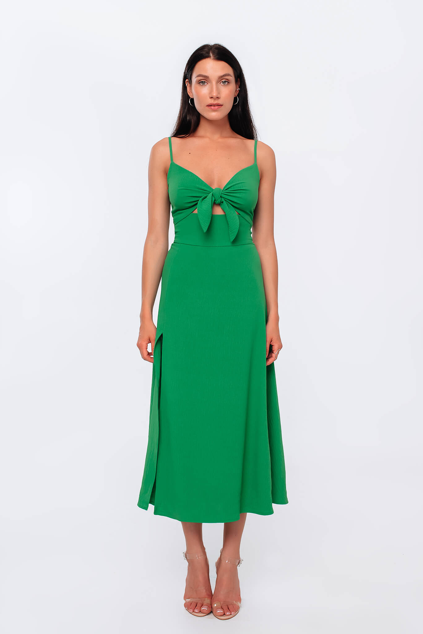 Доставка впродовж 2-5 робочих днівЕлегантна сукня на бретелях із зав’язкою на грудях. Спідниця вільного крою з розрізом