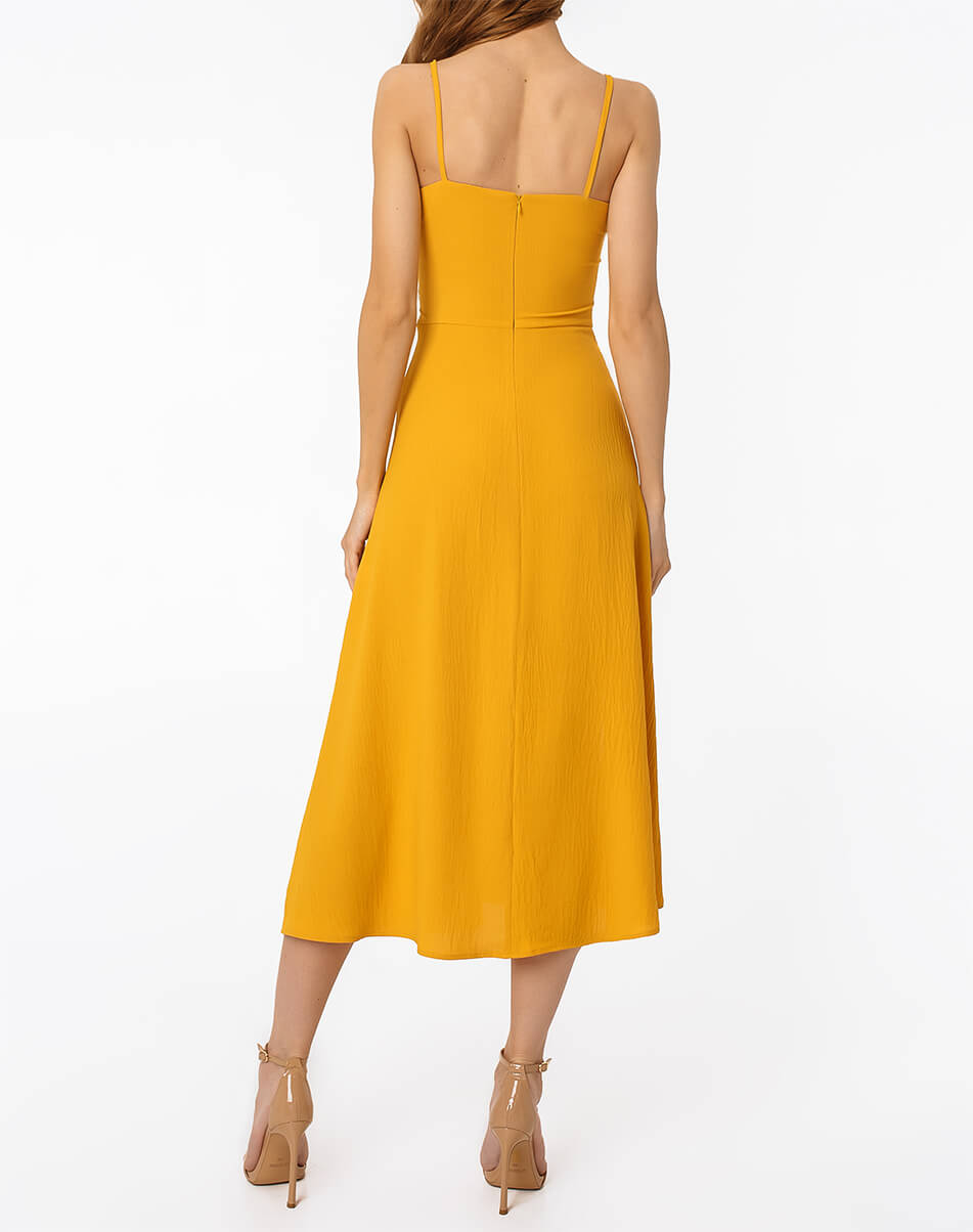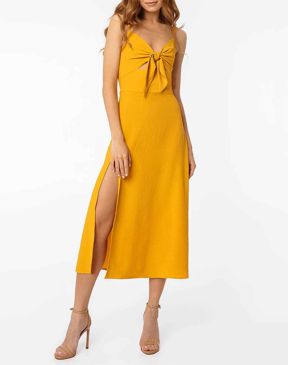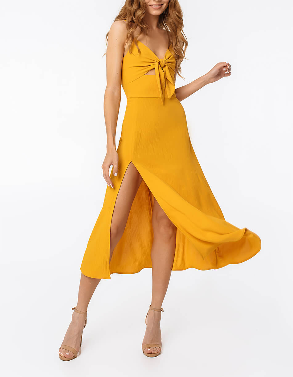 Доставка впродовж 2-5 робочих днівЕлегантна сукня на бретелях із зав’язкою на грудях. Спідниця вільного крою із розрізом.