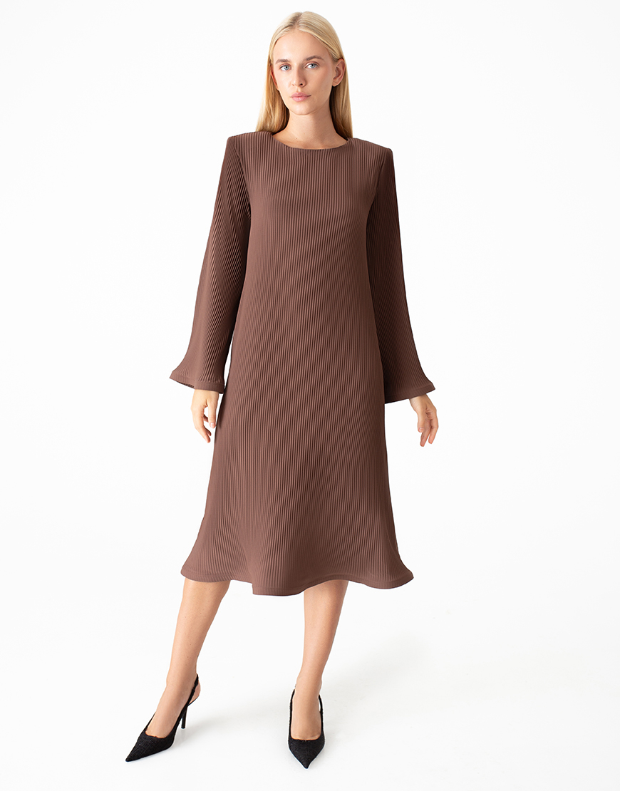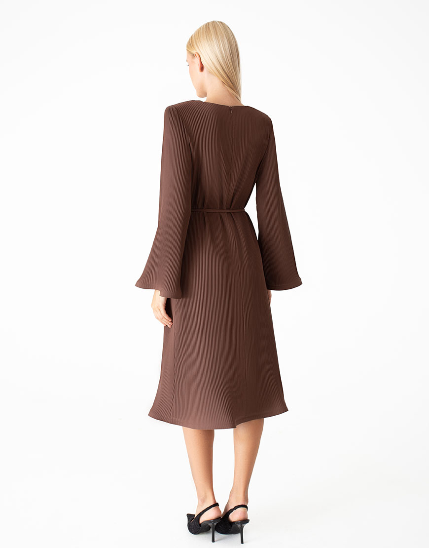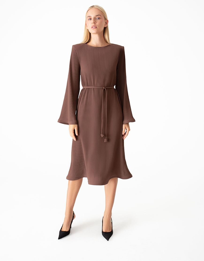 Елегантна сукня з гофрованого матеріалу в довжині міді має витончений силует і магнетичний ефект для оточуючих. Знімний пояс-шнурок у комплекті.