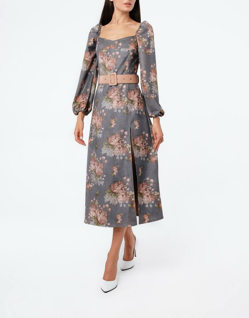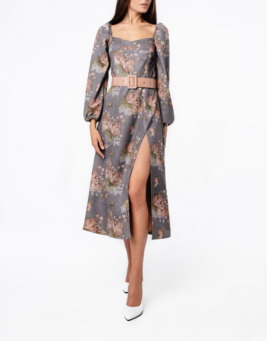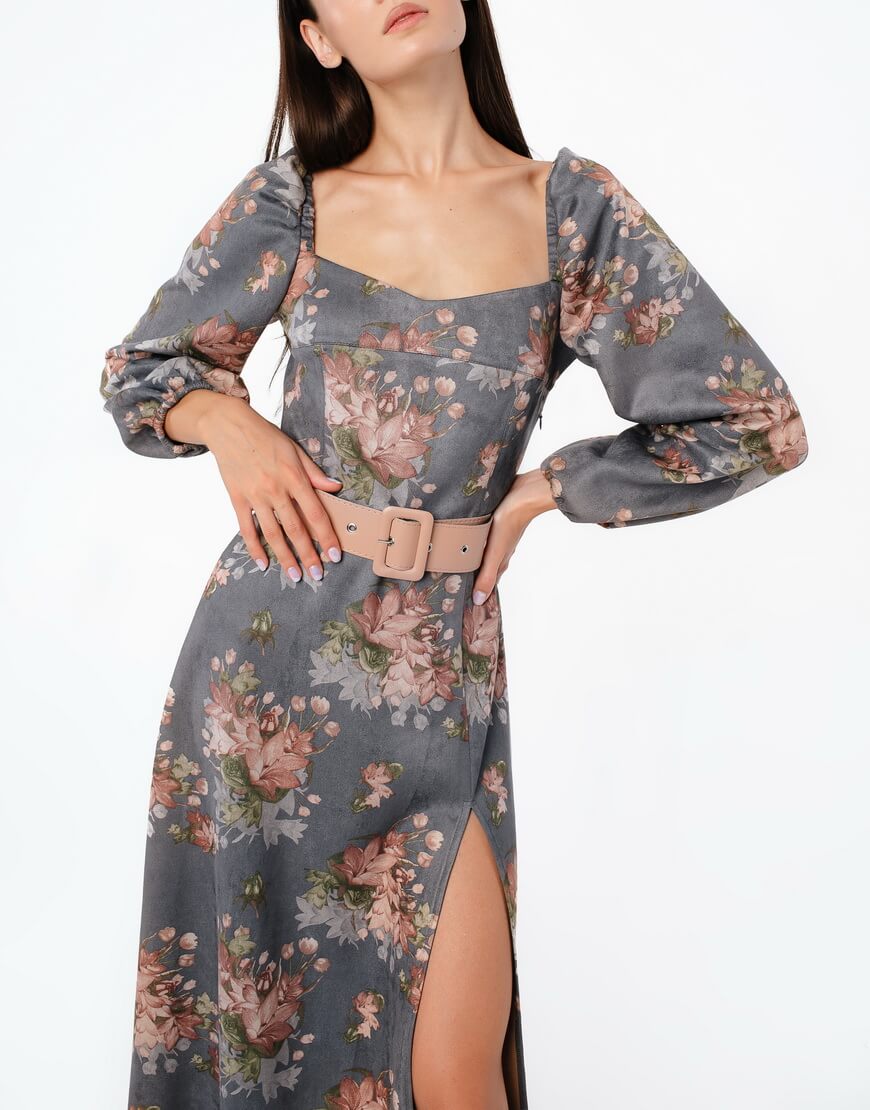 Сукня з еко-замші в довжині міді, з елегантним розрізом по ніжці, декорована контрастним ременем з еко-шкіри. Довжина виробу 114 см.