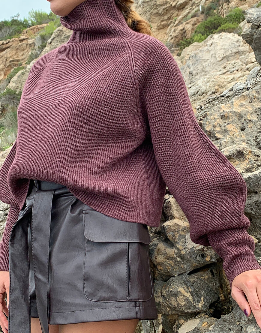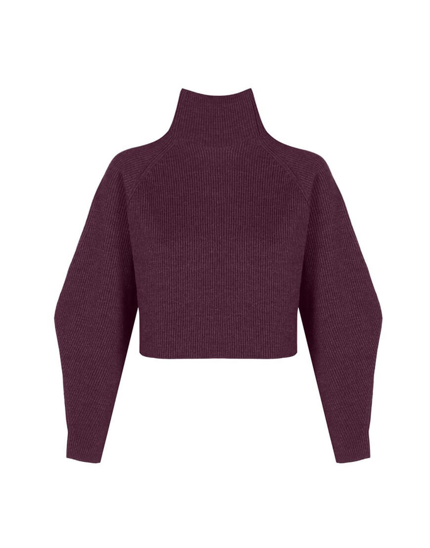Кроп светр з об’ємним рукавом і суцільнов’язаною стійкою з мериносової вовни. модель вільного силуету, укорочена.
