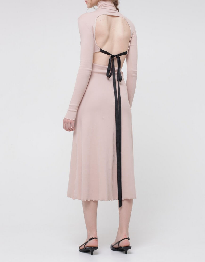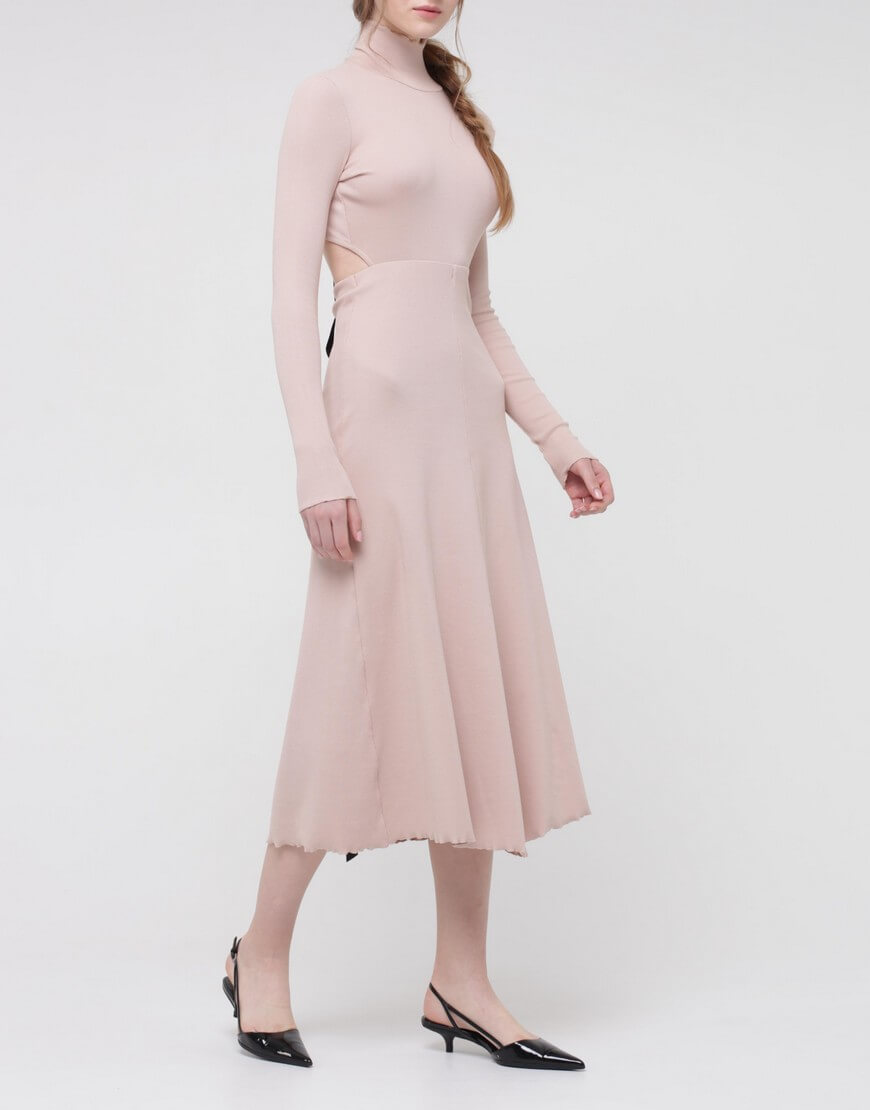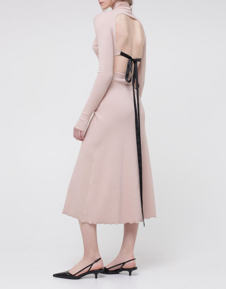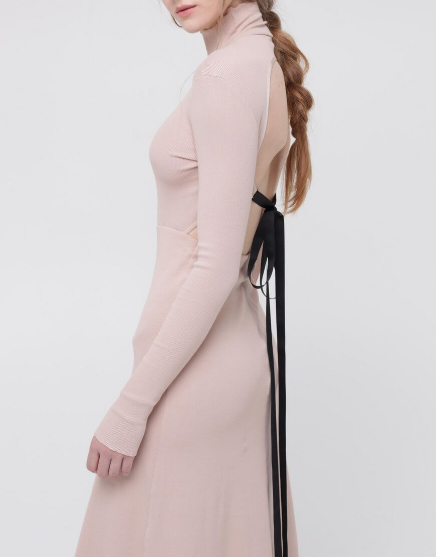 Трикотажна сукня з відкритою спиною на декоративному поясі у вигляді стрічки-зав’язки. Модель під горло, трапецієвидного силуету, прилегла по поличці і вільна до низу.