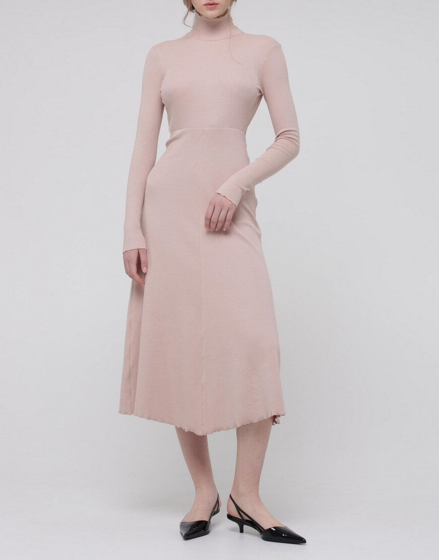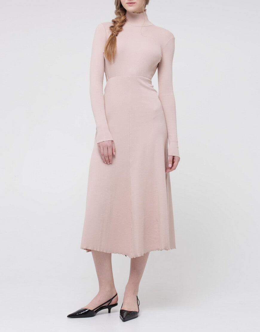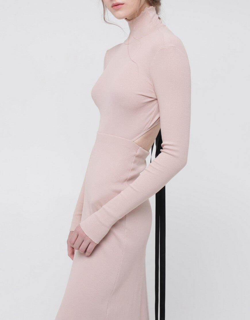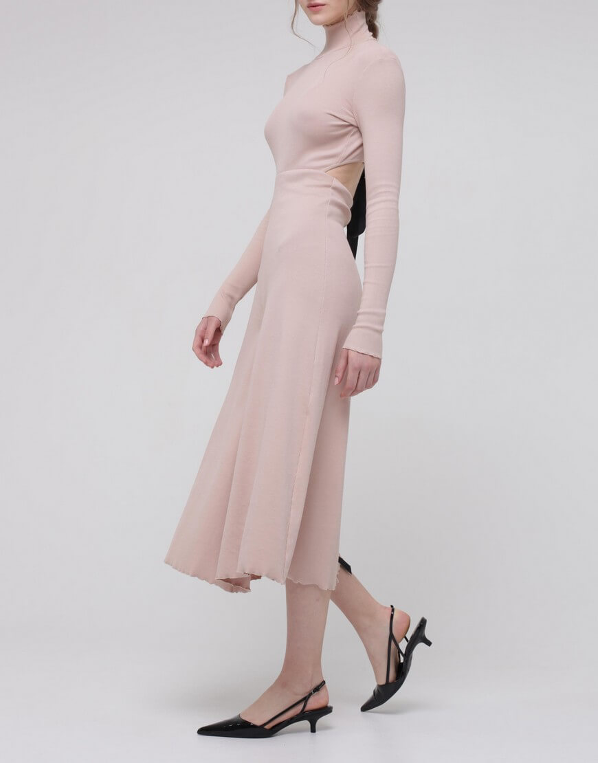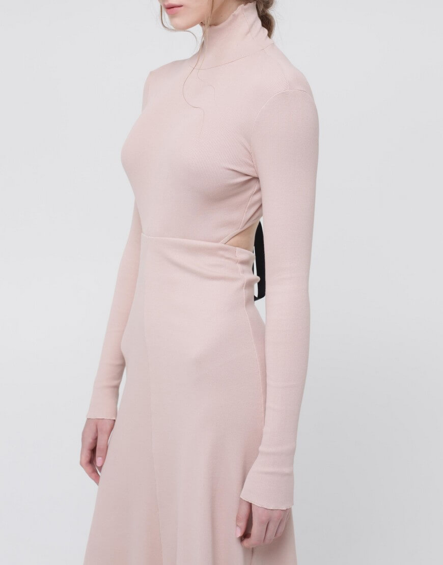 Трикотажна сукня з відкритою спиною на декоративному поясі у вигляді стрічки-зав’язки. Модель під горло, трапецієвидного силуету, прилегла по поличці і вільна до низу.