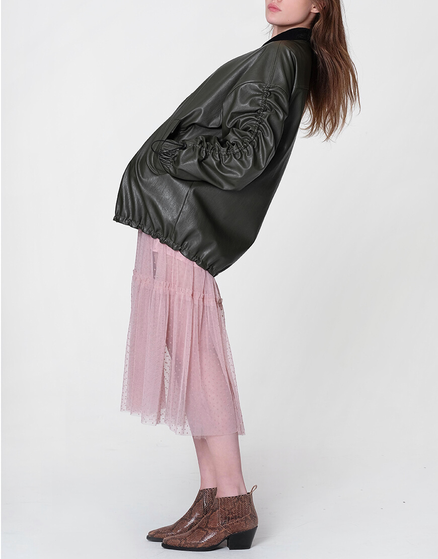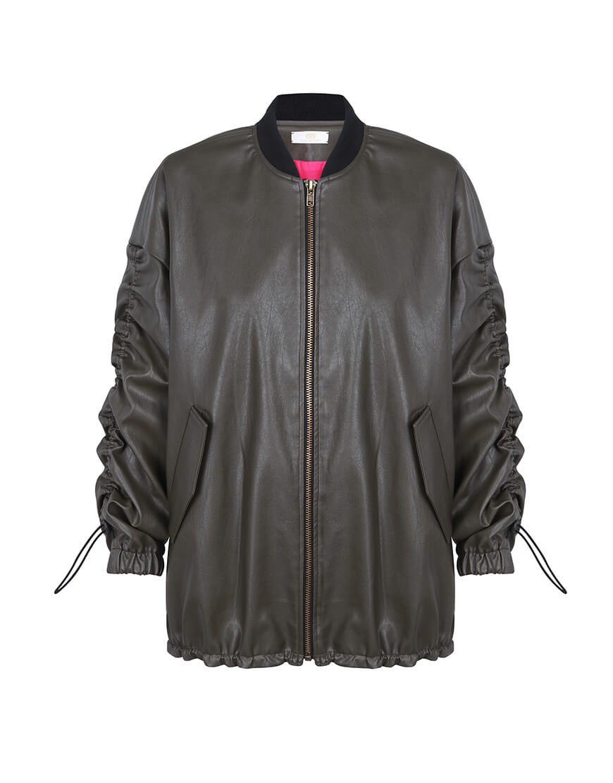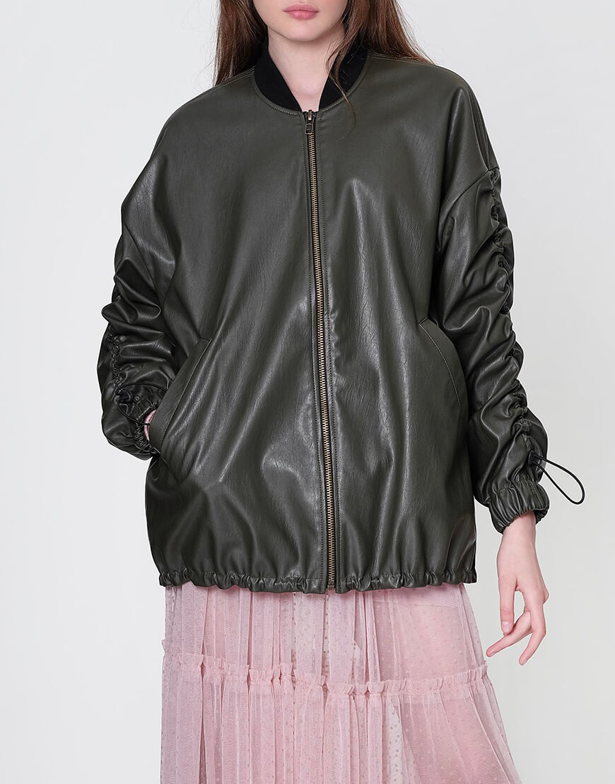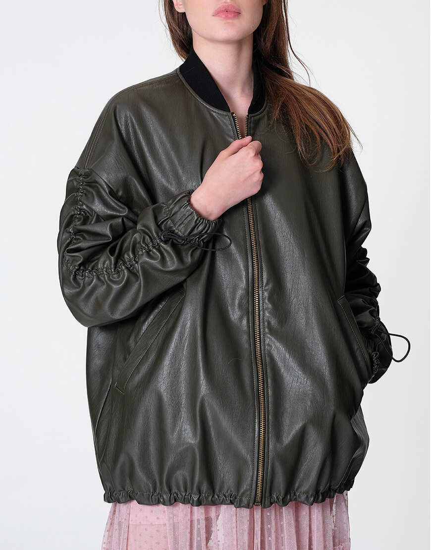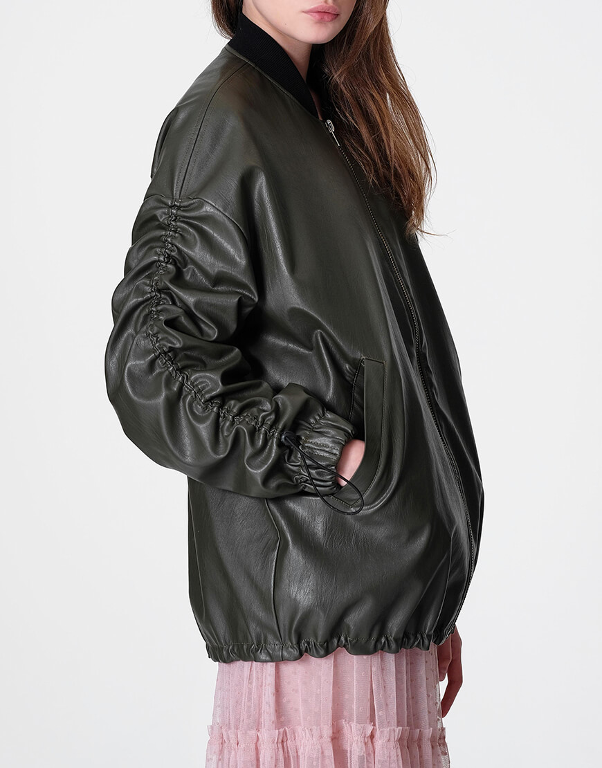 Бомбер оверсайз з еко-шкіри на яскравій підкладці кольору фуксії. Рукав спущений і присборений на куліску з регулятором. Низ виробу подовжений на куліці з регулятором. Застібка на блискавці.