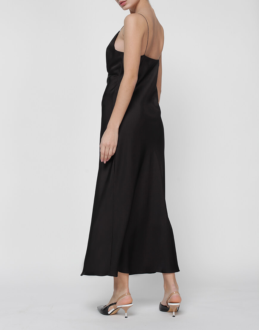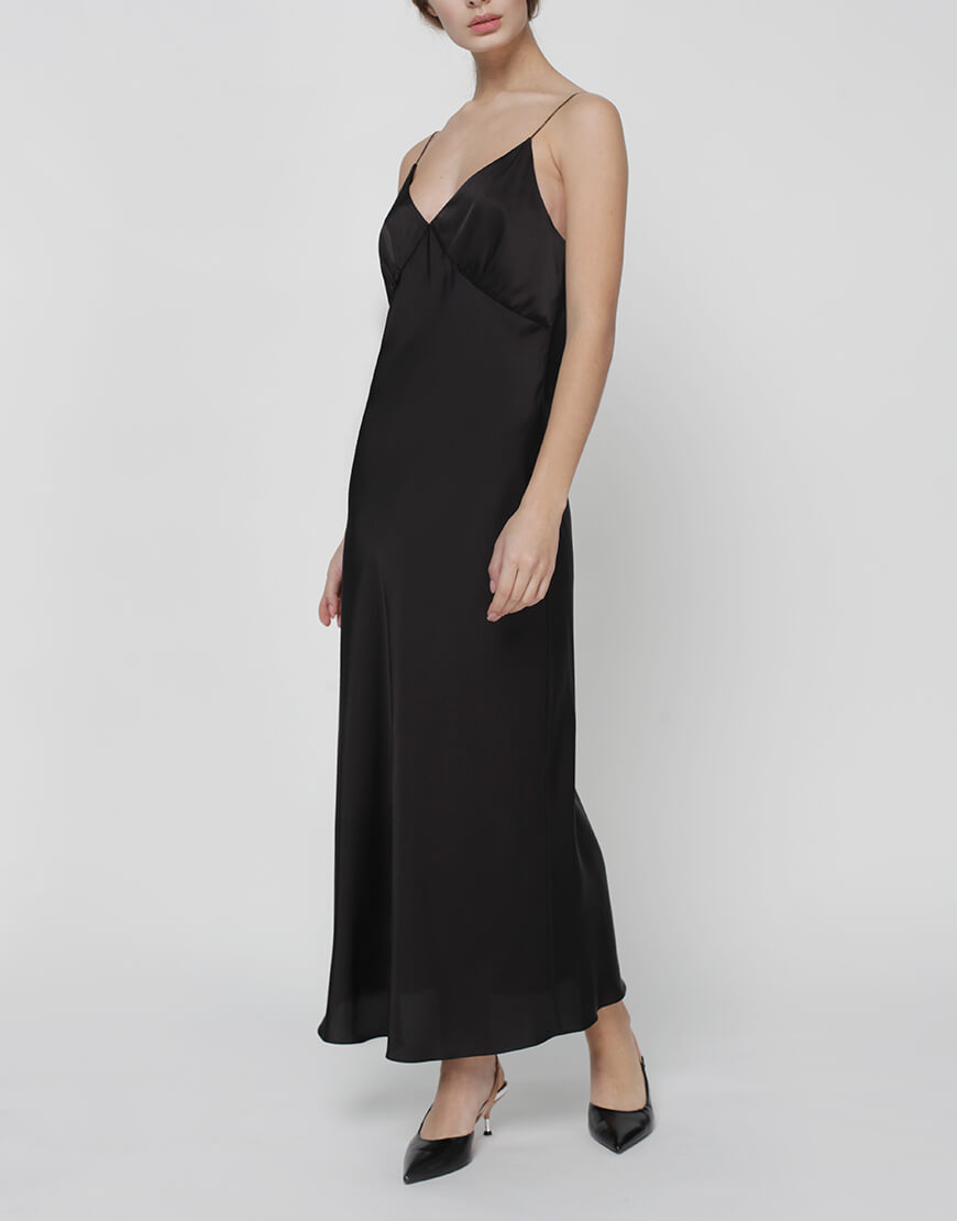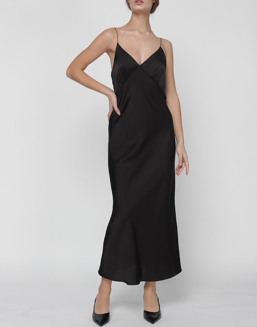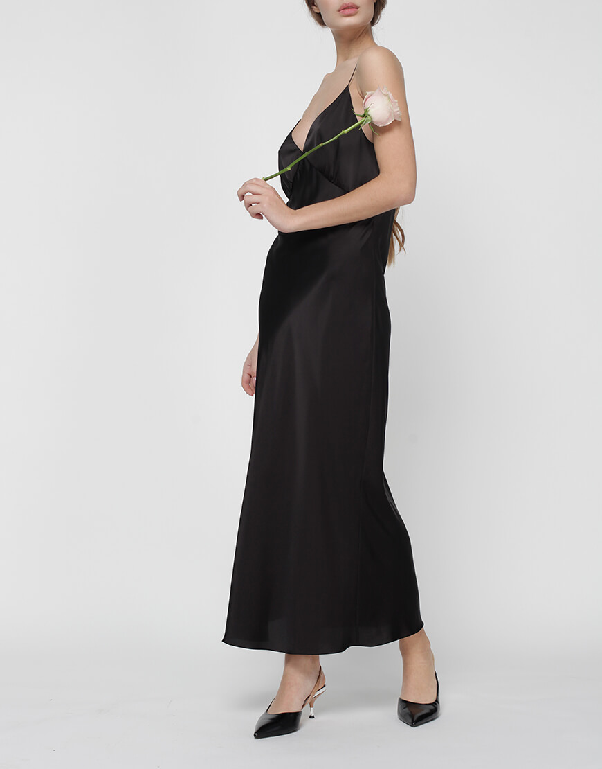Сукня комбінація “Peony” складного крою по косій і відрізною чашкою, призібраною для поліпшення посадки в області грудей. Бретелі декоровані стразами. Сукня довжини міді на підкладці з віскози.