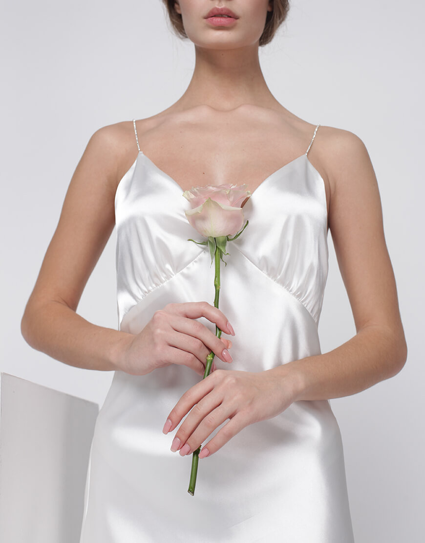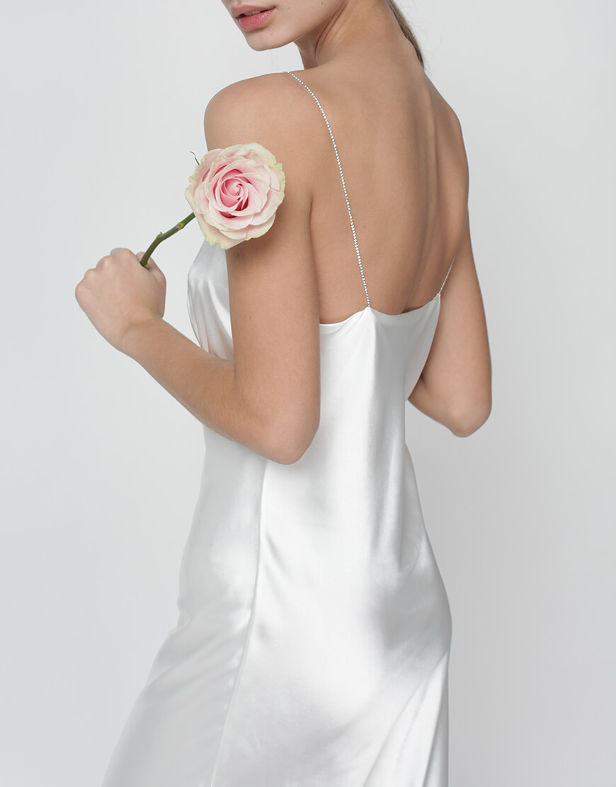 Сукня комбінація “Peony” складного крою по косій і відрізною чашкою призібраною для поліпшення посадки в області грудей. Ця модель йде без стразів на бретельках, їх можна додати за 500 грн. Сукня довжини міді на підкладці з віскози.