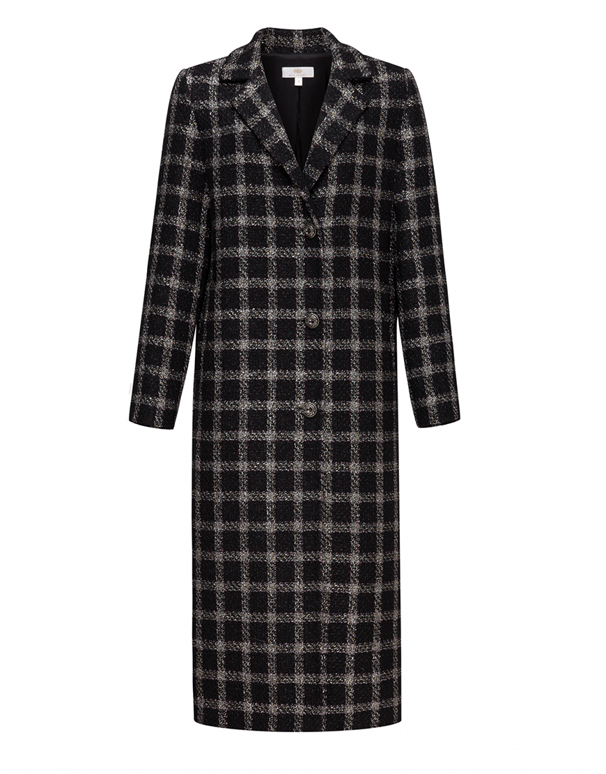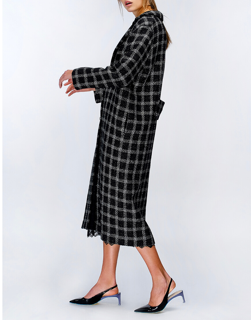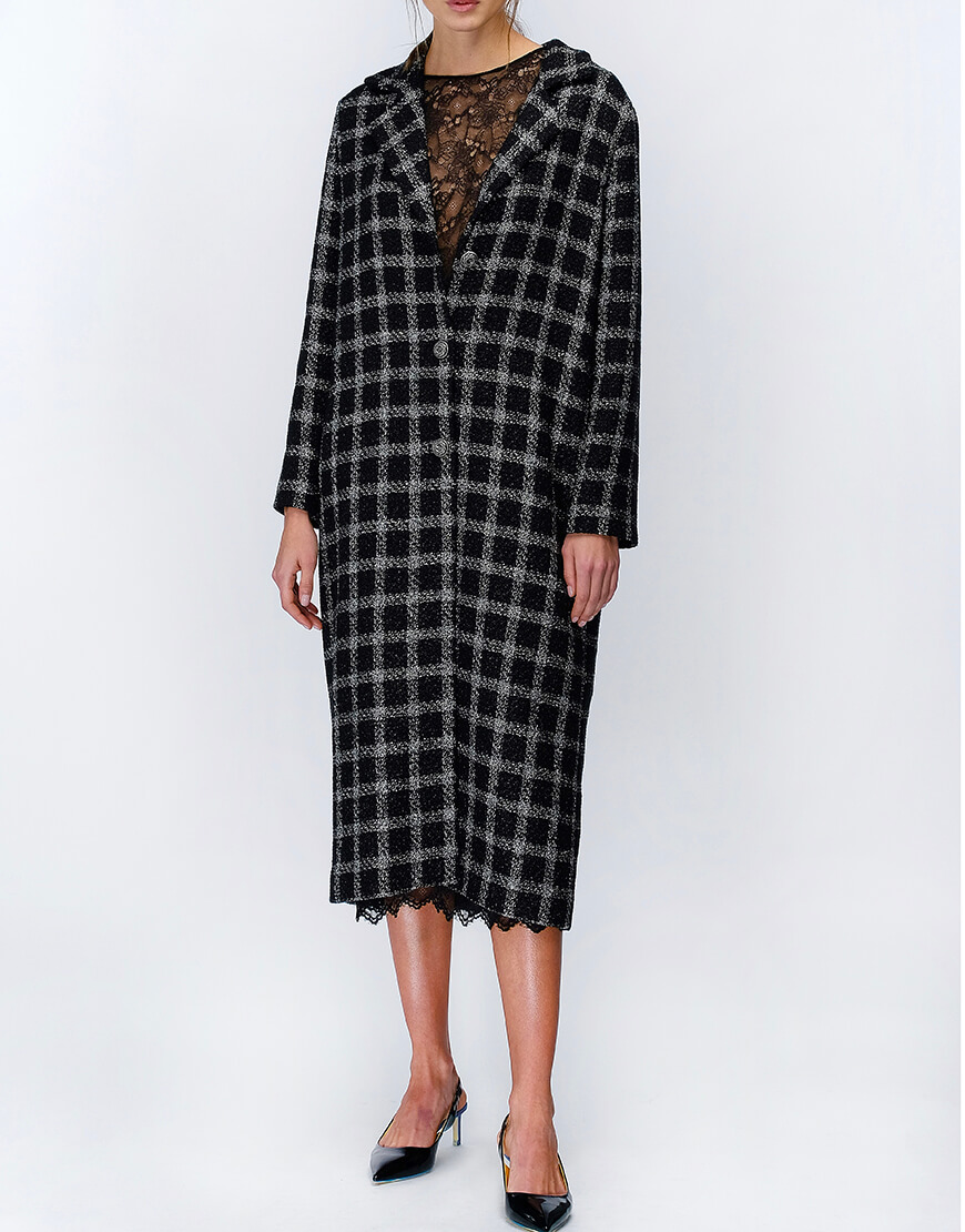 Пальто з твідової тканини в клітинку з люрексу на підкладці з віскози. Модель прямого силуету з подовженим плечем, однобортна зі шліцом ззаду, застібка на ґудзиках.