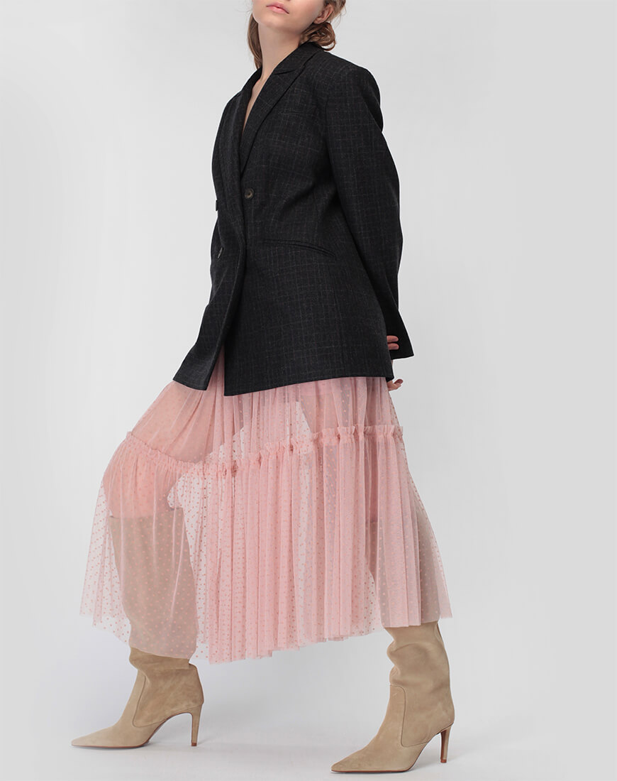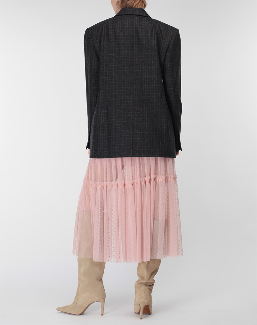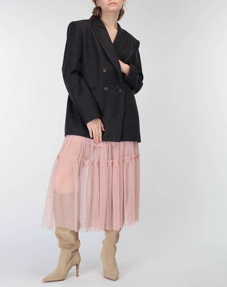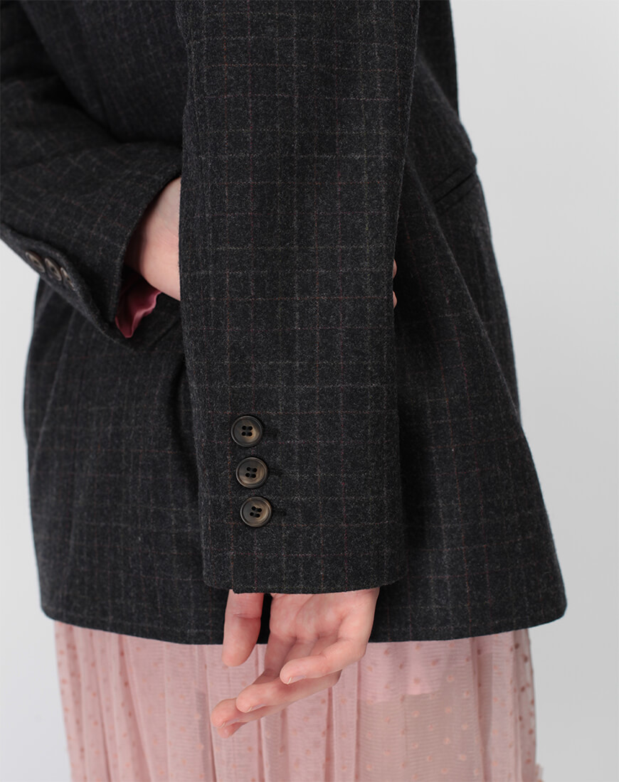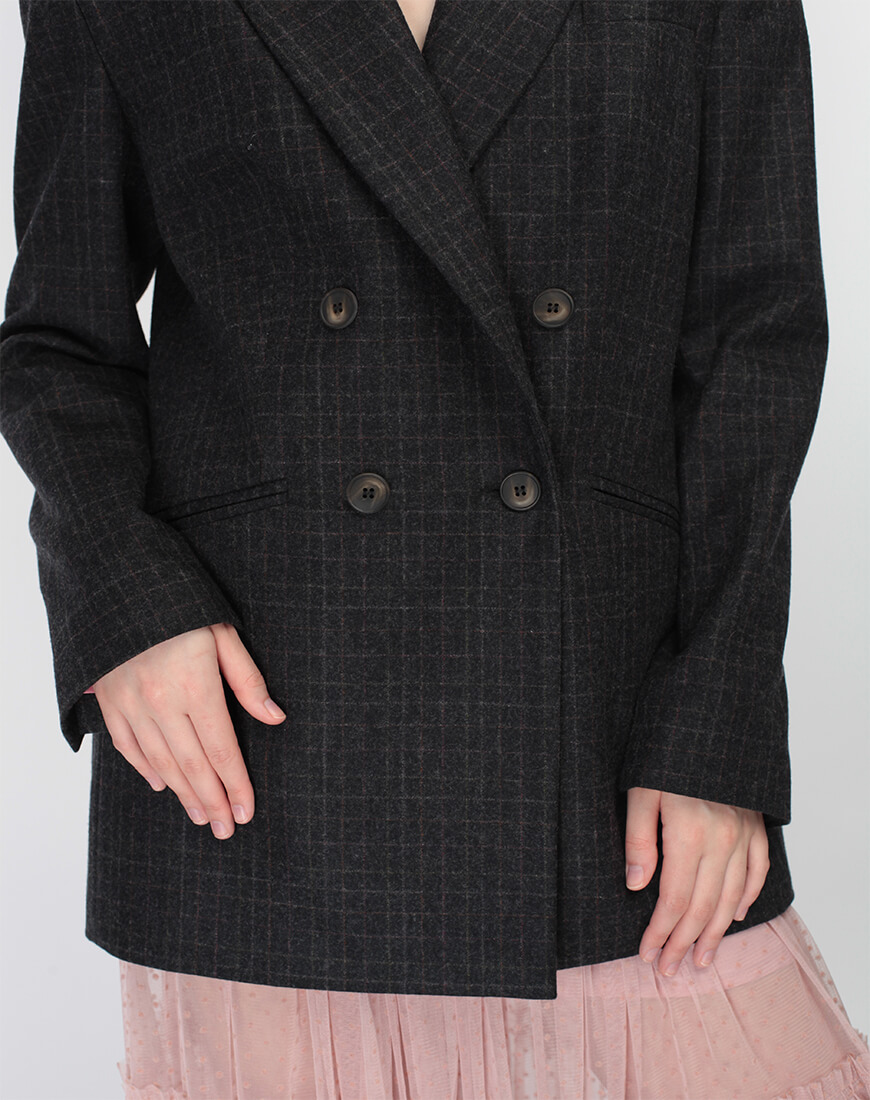 Жакет у стилі бойфренд з кашеміру на підкладці з віскози. Модель двобортна прямого силуету з подовженим плечем.