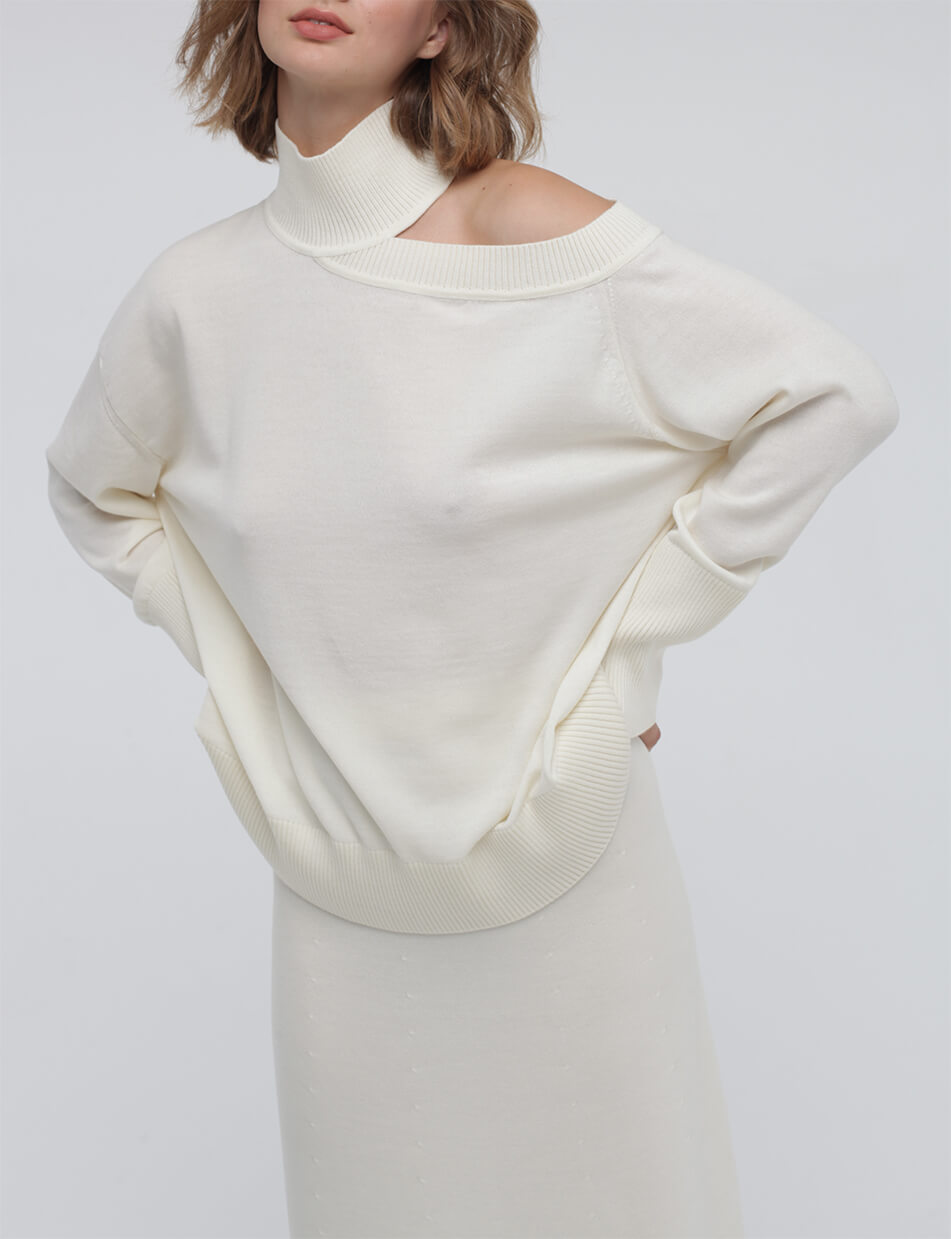 Джемпер з відкритим плечем з мериносової вовни. Модель оверсайз прямого силуету з широким манжетом.
