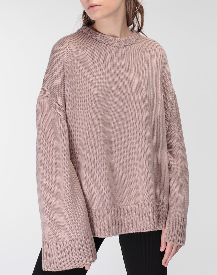 Об’ємний джемпер з широким манжетом з вовни. Модель вільного силуету зі спущеним плечем та невеликими розрізами по боках.