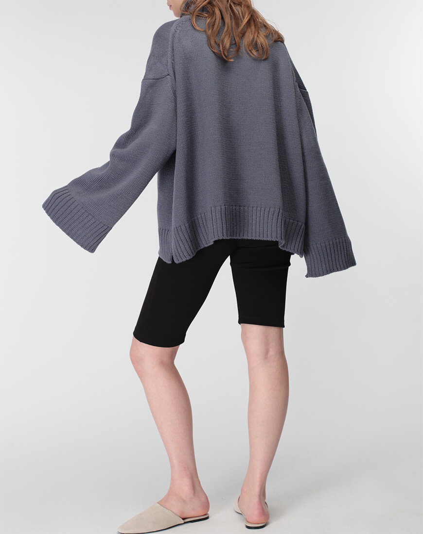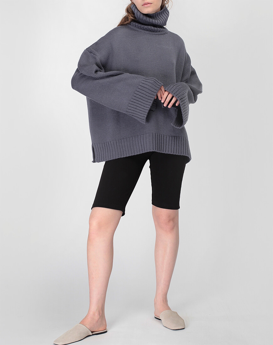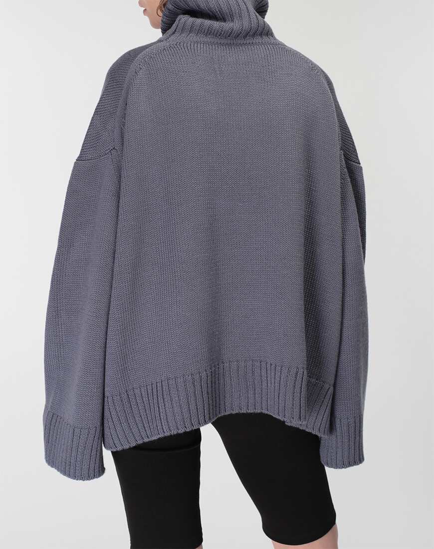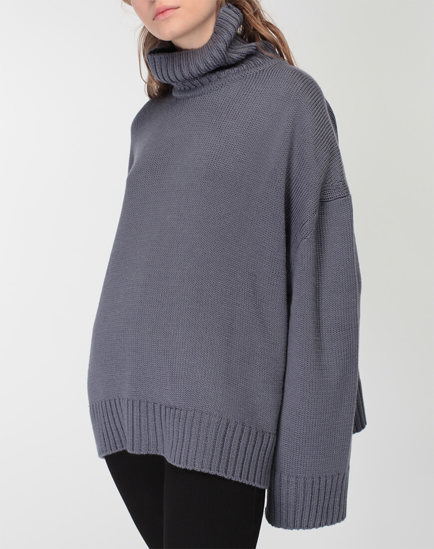 Об’ємний джемпер з широким манжетом з вовни зі стійкою під горло. Модель вільного силуету зі спущеним плечем і невеликими розрізами по боках.