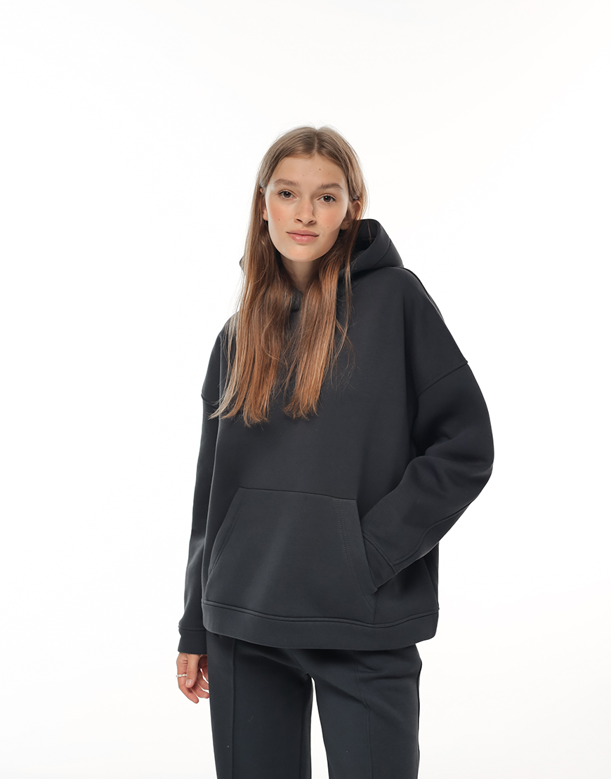 Базове худі з зимового трикотажу з начосом – must have нашого бренду. Худі завоювало свою популярність завдяки універсальній моделі: помірно об’ємній, з комфортним капюшоном і середньою довжиною виробу. Ця модель завжди доступна в наявності в різних кольорах. Худі можна поєднувати з двома видами штанів: балонами та палаццо зі стрілками