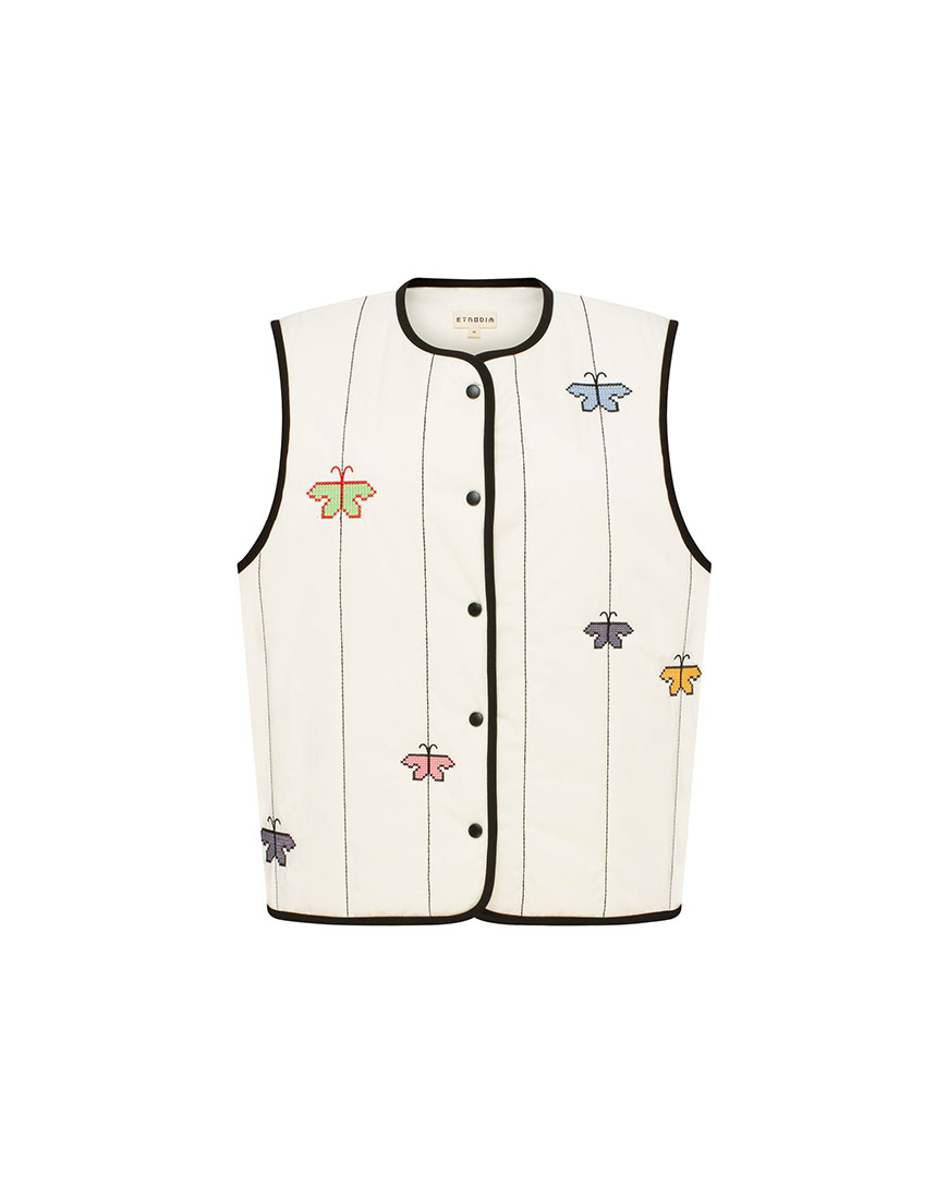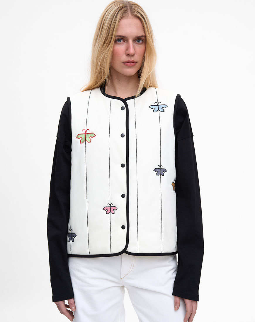 Ми розшили його барвистими метеликами, натхненними наївним оздобленням рушників минулого століття. Техніка виконання орнаменту наслідує традиційну вишивку хрестиком.