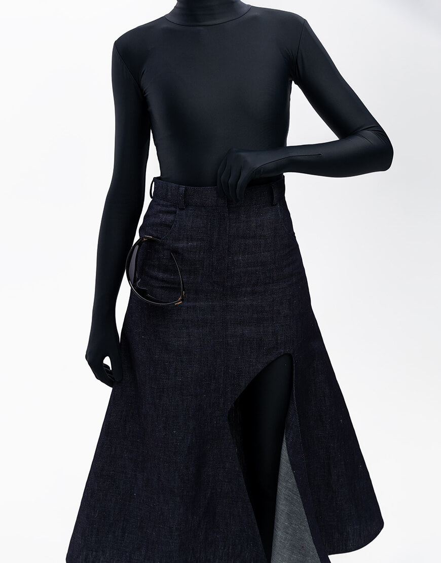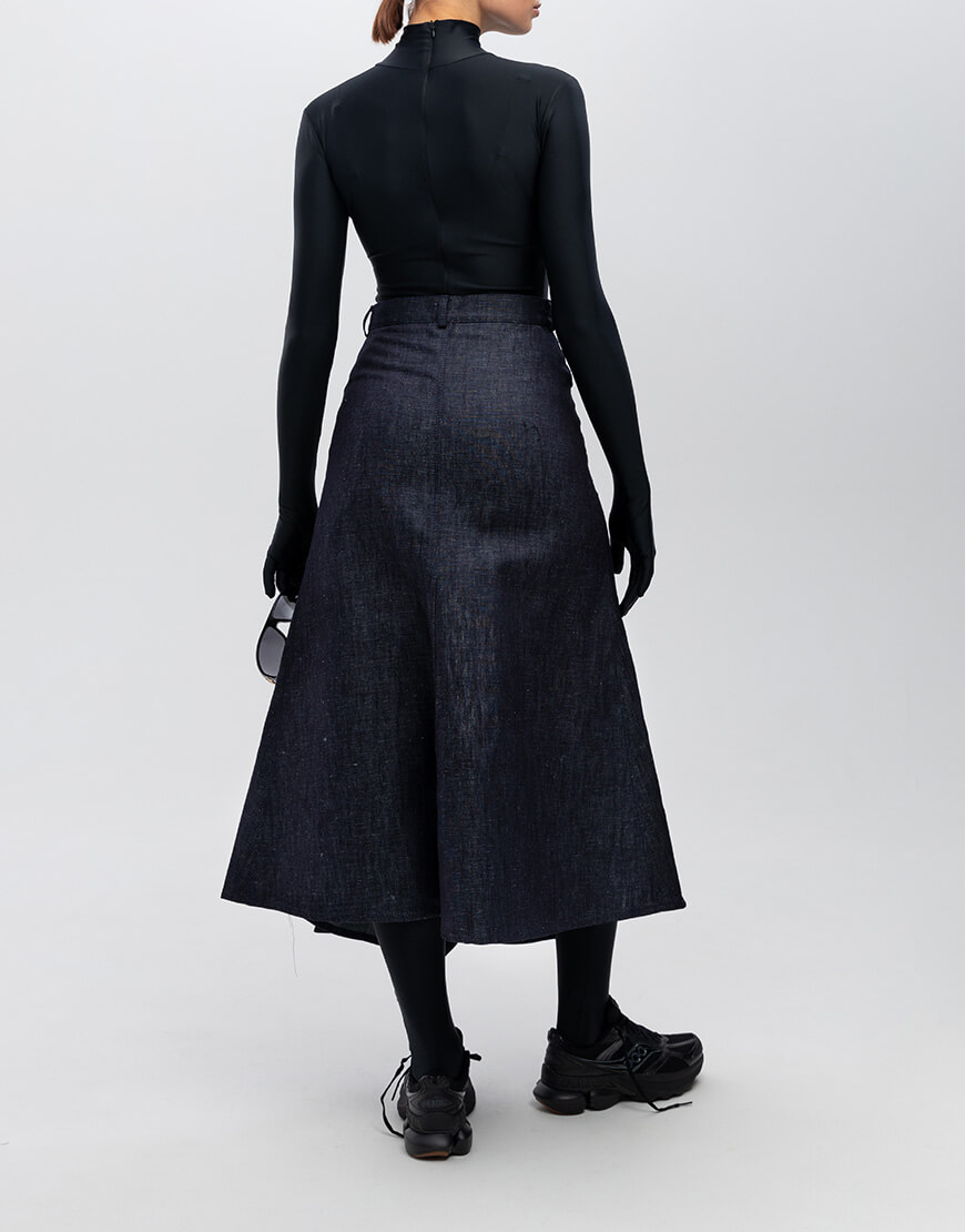Доставка впродовж 2-7 робочих днівАсиметрична джинсова спідниця довжини міді. Універсальна спідниця з оригінальним кроєм та асиметричним вирізом, яка стане акцентом у весняно-літньому гардеробі, як в класичному так і в спортивному виконанні. Склад джинсу 100% льон, що робить її комфортною для літнього періоду.
