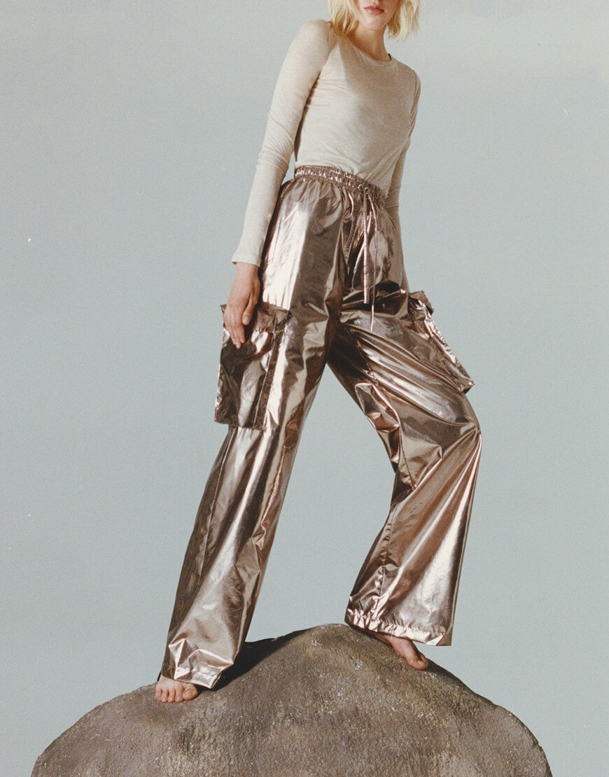 Доставка впродовж 2-7 робочих днівЗолоті штани Cargo для піших прогулянок. Модель з широкими кишенями з обох боків і широким поясом. Особливо актуально з короткими пуховиками.
