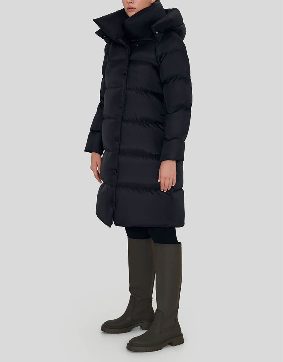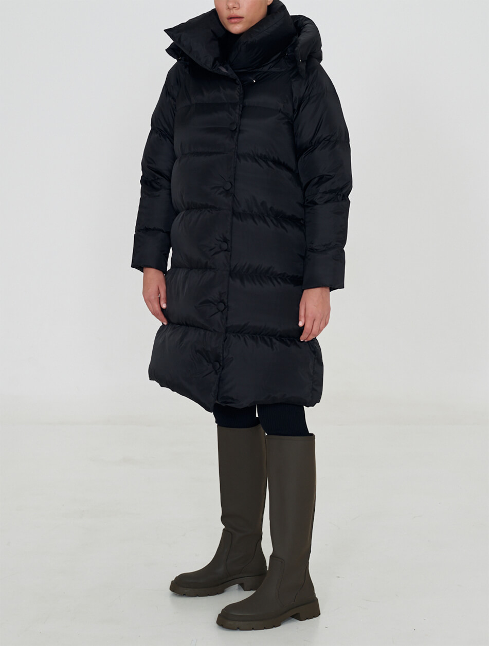 Пуховик- ковдра середньої довжини з капюшоном. Пухове пальто з карманами в бокових швах на потайних блискавках. Капюшон виробу на блискавці і може бути повністю відстебнутий.