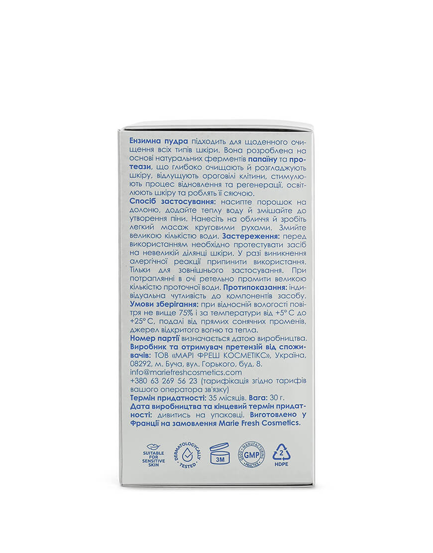 Доставка впродовж 2-5 робочих днівЕнзимна пудра, розроблена на основі натуральних ферментів – папаїну та протеази, глибоко очищає й розгладжує шкіру, відлущує ороговілі клітини, стимулює процес відновлення та регенерації, освітлює шкіру та робить її сяючою. Підходить для щоденного очищення для всіх типів шкіри.