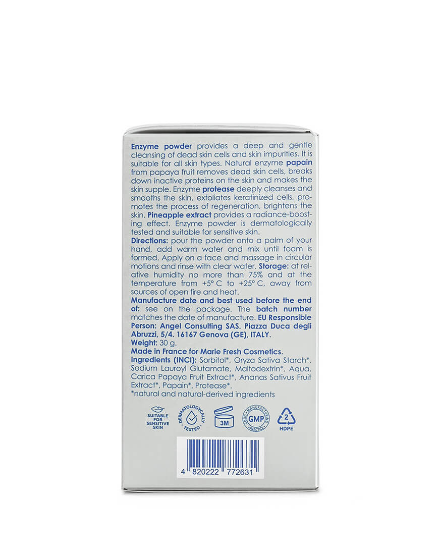 Склад: Sorbitol*, Oryza Sativa Starch*, Sodium Lauroyl Glutamate, Maltodextrin*, Aqua, Carica Papaya Fruit Extract*, Ananas Sativus Fruit Extract*, Papain*, Protease*.