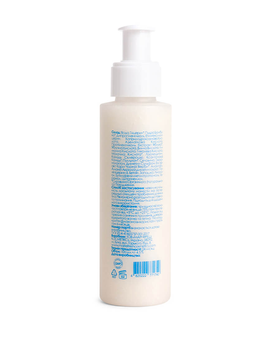 Склад: Aqua, Glycerin*, Bambusa Arundinacea Stem Powder*, Urea, Gluconolactone, Dimethyl Sulfone, Salix Nigra Bark Extract*, Dipropylene Glycol, Sodium Acrylates Copolymer, Polyglycerin-6*, Azelaic Acid*, Betaine*, Propylene Glycol, Malic Acid, Pyrus Malus Fruit Extract*, Glycolic Acid, Lactic Acid, Citric Acid, Allantoin, Lecithin*, Sodium Polyacryloyldimethyl Taurate, Ethylhexylglycerin, Caprylhydroxamic Acid, Parfum, Limonene, Hydroxycitronellal, Citronellol, Hexyl Cinnamal, Geraniol.