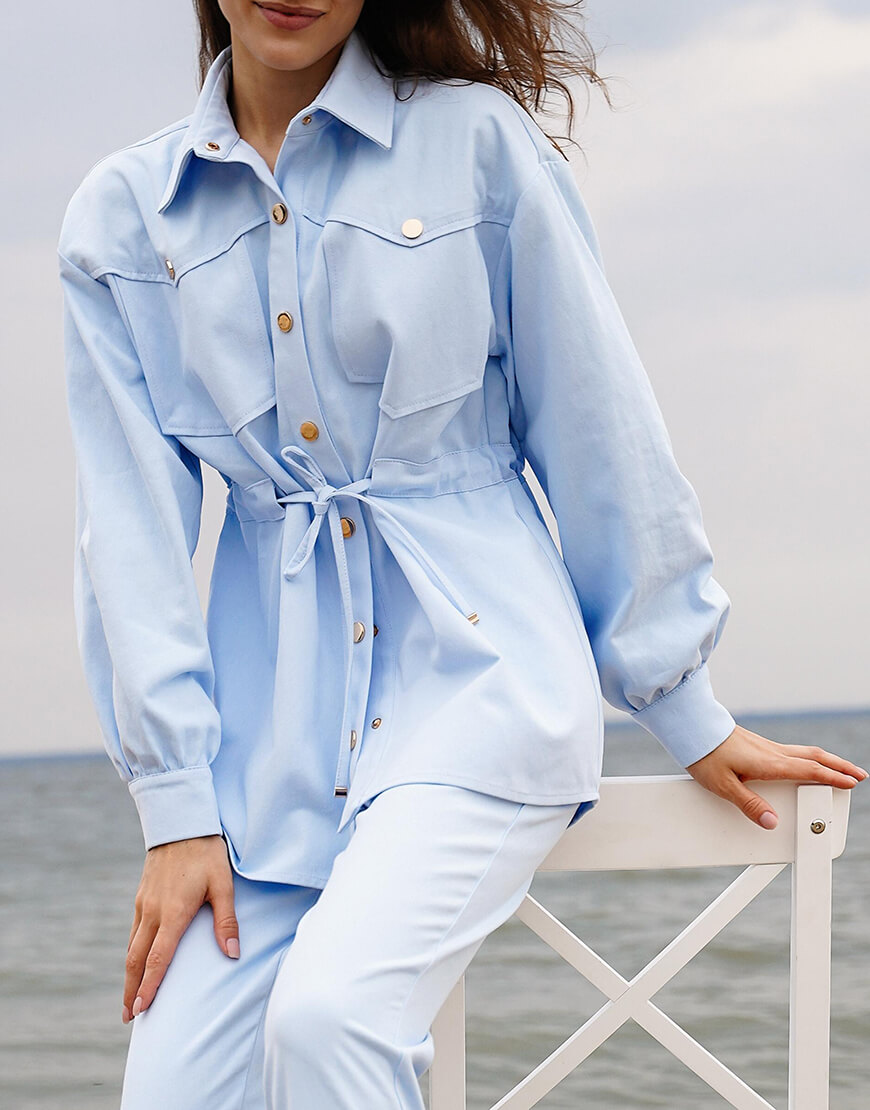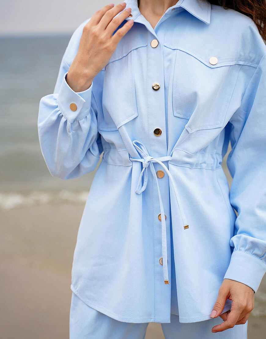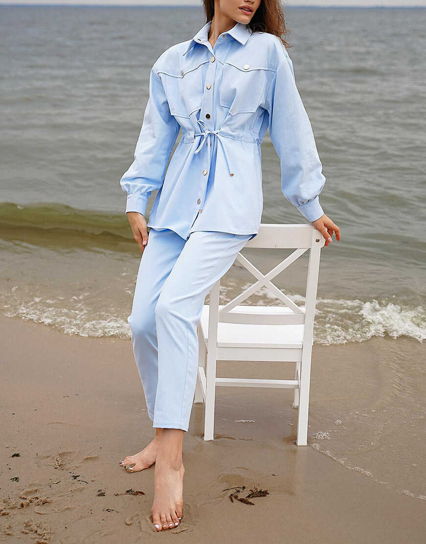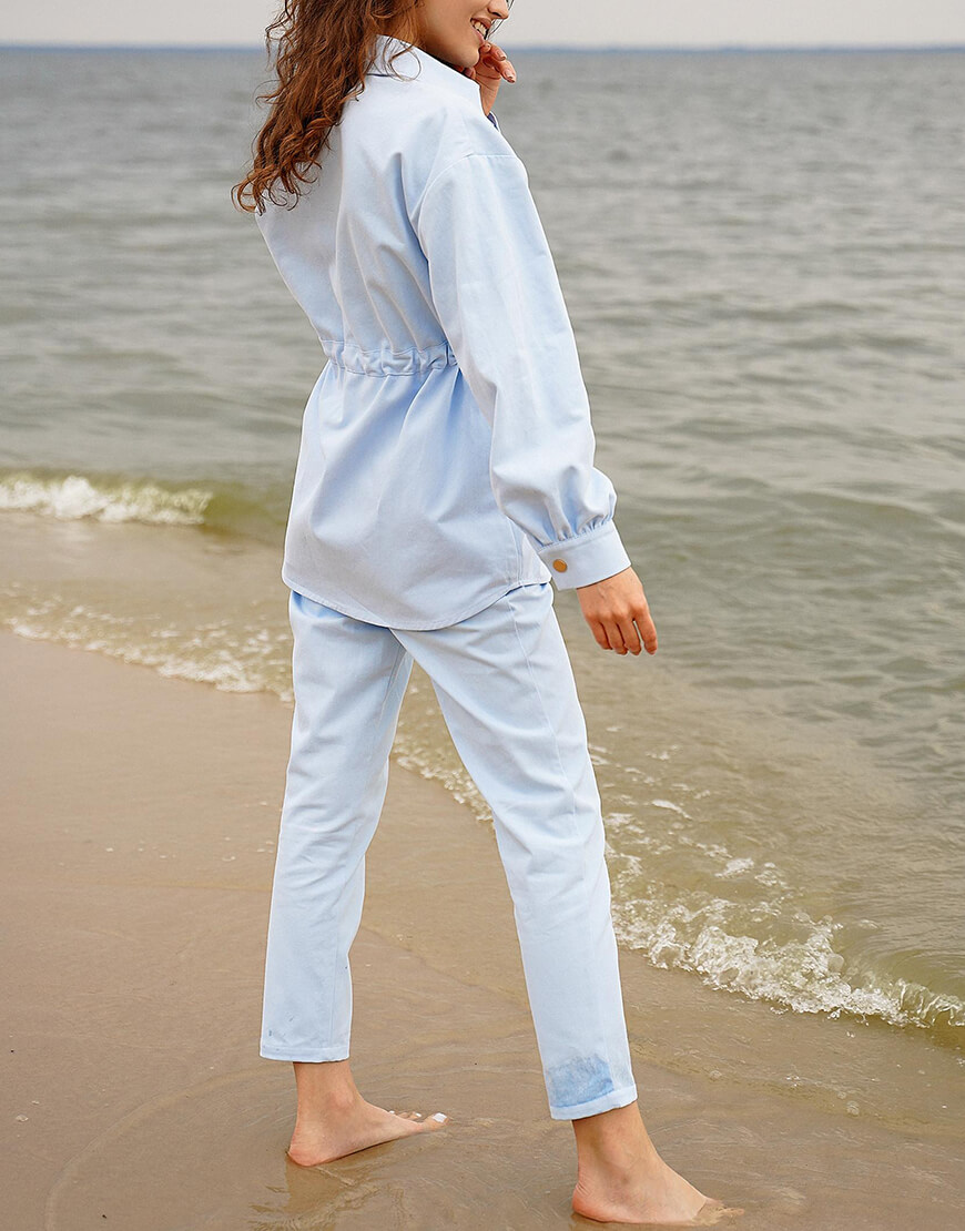 Стильний костюм із бавовняної джинсової тканини. Складається з курточки та штанів. Курточка об’ємного крою з куліскою на талії, застібається на металеві кнопки. Штани з високою лінією талії, застібаються на потаємну блискавку і кнопки.