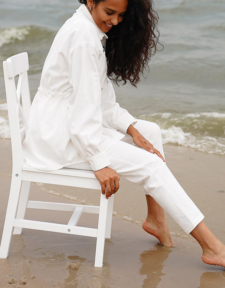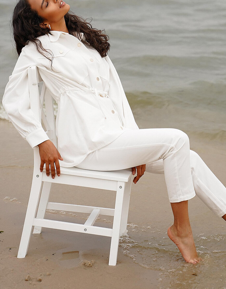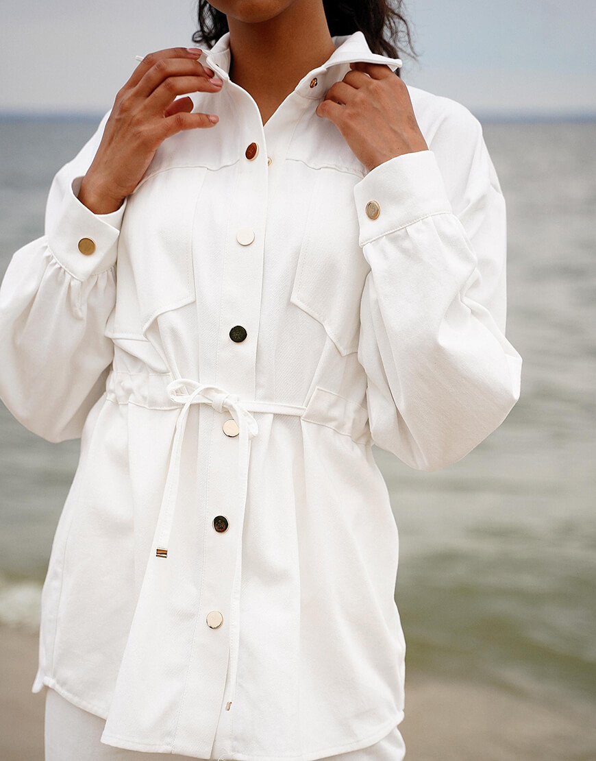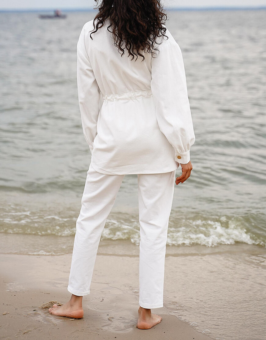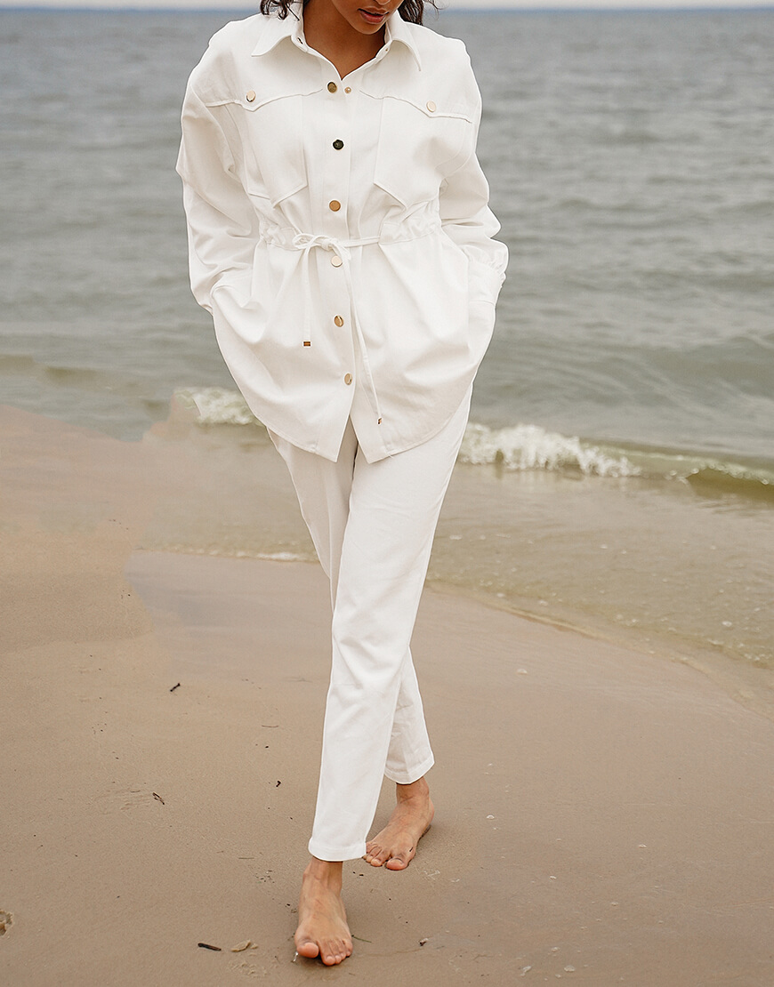 Стильний костюм із бавовняної джинсової тканини. Складається з курточки та штанів. Курточка об’ємного крою з куліскою на талії, застібається на металеві кнопки. Штани з високою лінією талії, застібаються на потаємну блискавку і кнопки.