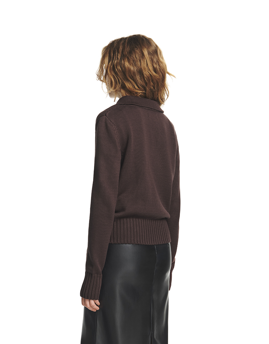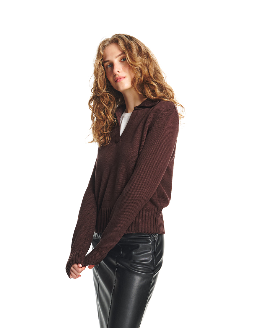 Вкорочений джемпер-поло з натуральної бавовни у стильному шоколадному кольорі – ідеальне доповнення до модного гардероба. Комфортний, м’який і приємний до тіла, цей джемпер має класичний комір-поло, що додає образу елегантності. Завдяки вкороченому крою чудово підкреслює талію, а манжети та нижній край на резинці забезпечують ідеальну посадку. Легко комбінується з джинсами, брюками чи спідницями, створюючи універсальні та стильні образи на кожен день.