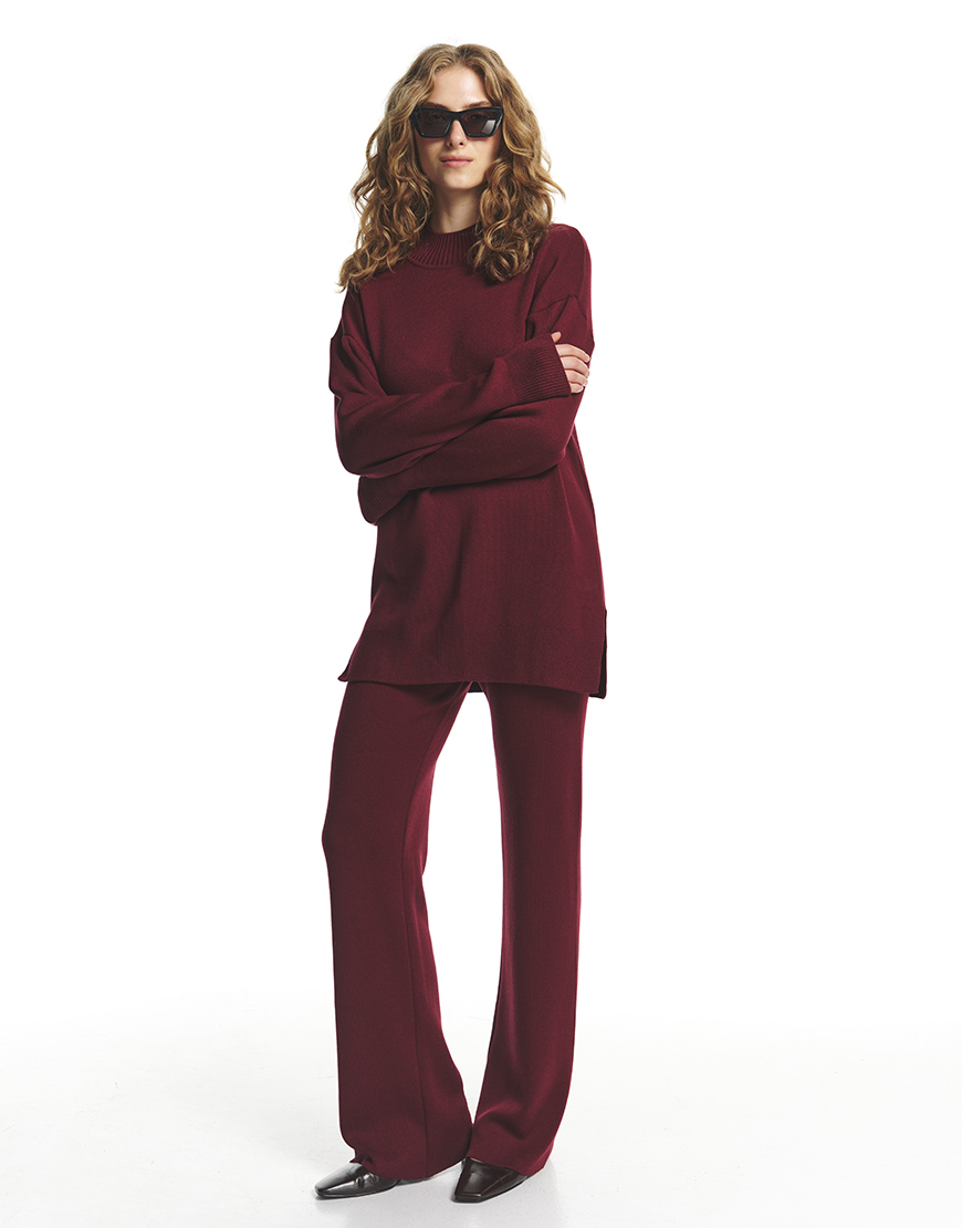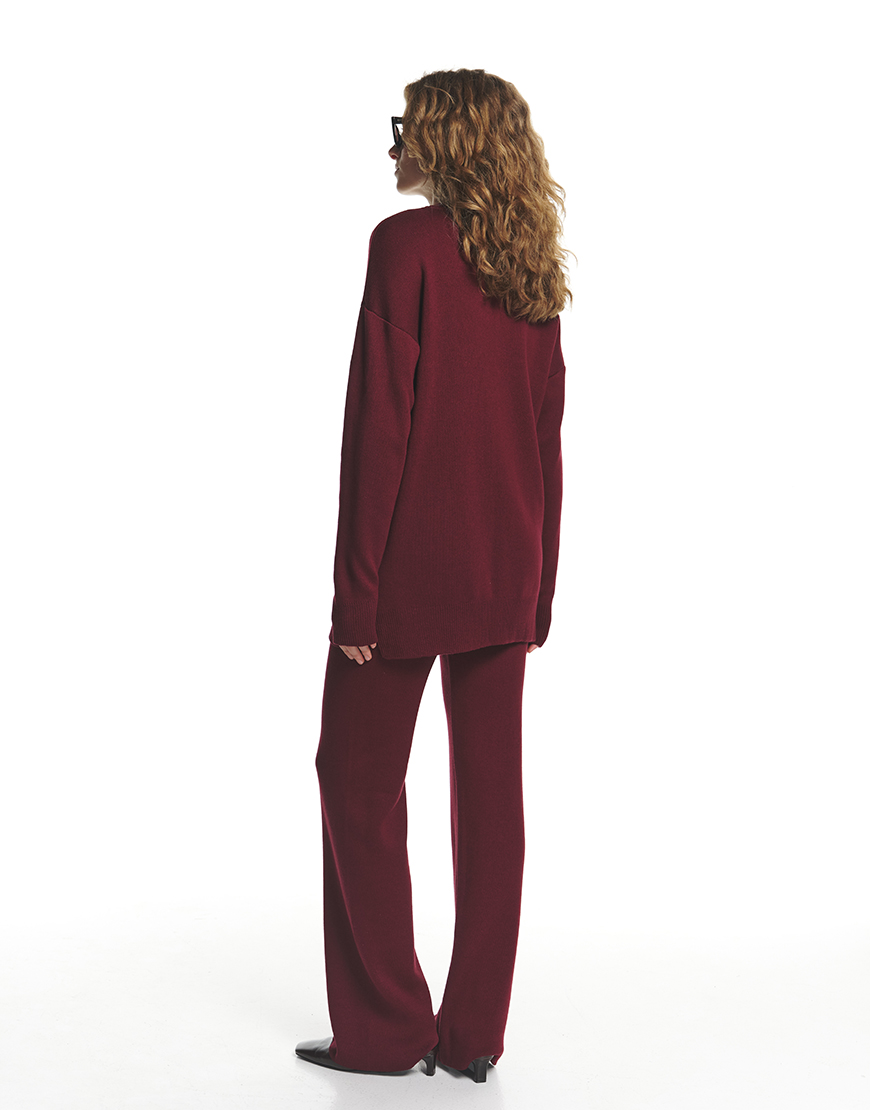 Стильний і комфортний костюм із бавовни в насиченому бордовому кольорі стане ідеальним вибором для поєднання елегантності та зручності. Штани широкого крою з високою посадкою доступні у двох варіантах довжини — 103 см і 109 см, мають пояс на резинці із зав’язками для ідеальної посадки та виконані без кишень, що підкреслює їхню мінімалістичність. Светр доповнює комплект завдяки малій круглій горловині, спущеному рукаву та подовженому силуету, створюючи стильний і розслаблений образ. Натуральна бавовна забезпечує м’якість і комфорт протягом усього дня, роблячи цей костюм ідеальним для будь-яких ситуацій.