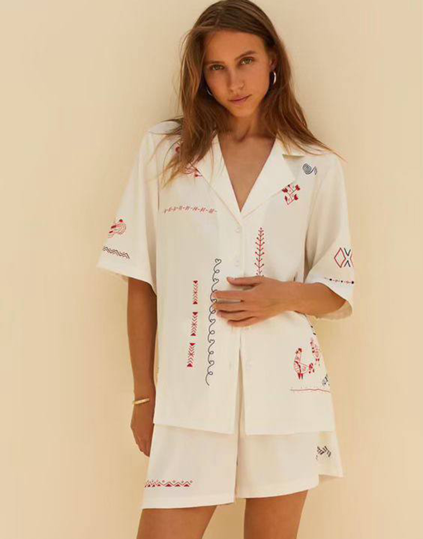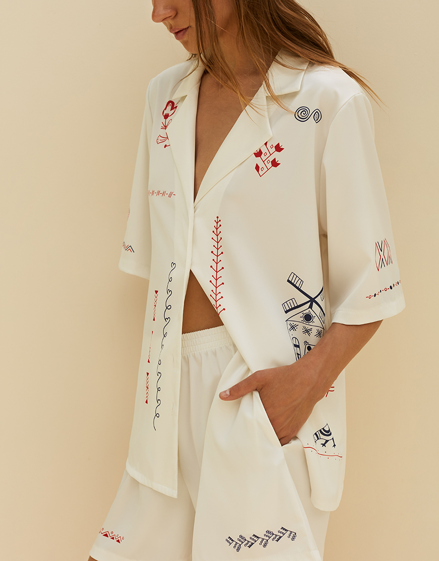 Доставка впродовж 1-2 робочих днівШорти “Трипілля” вільного крою. Виготовлені із ніжного сатину у молочному кольорі. Декоровані авторськими орнаментами, натхненними символікою трипільської культури. Ідеальні для літа — комфортні, стильні і з українським характером.