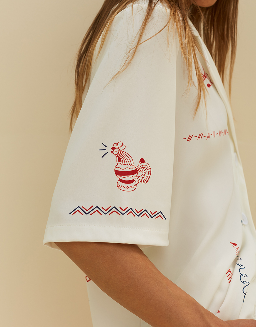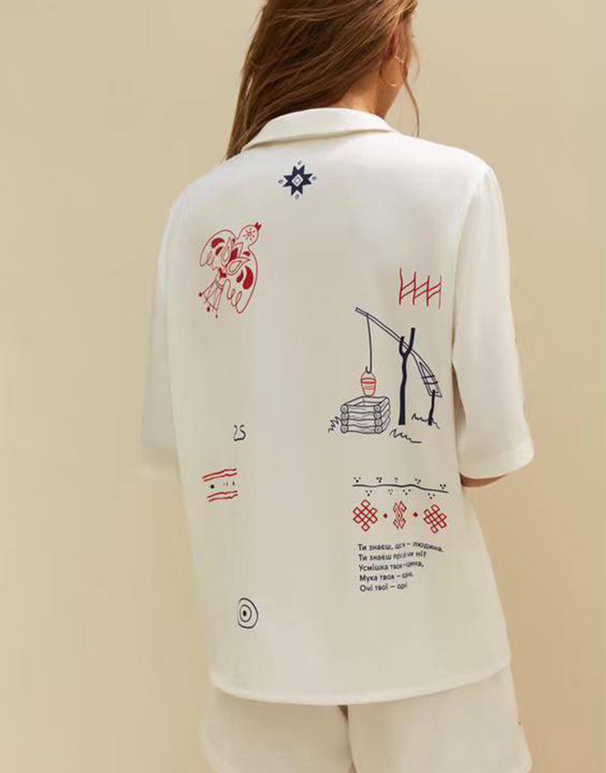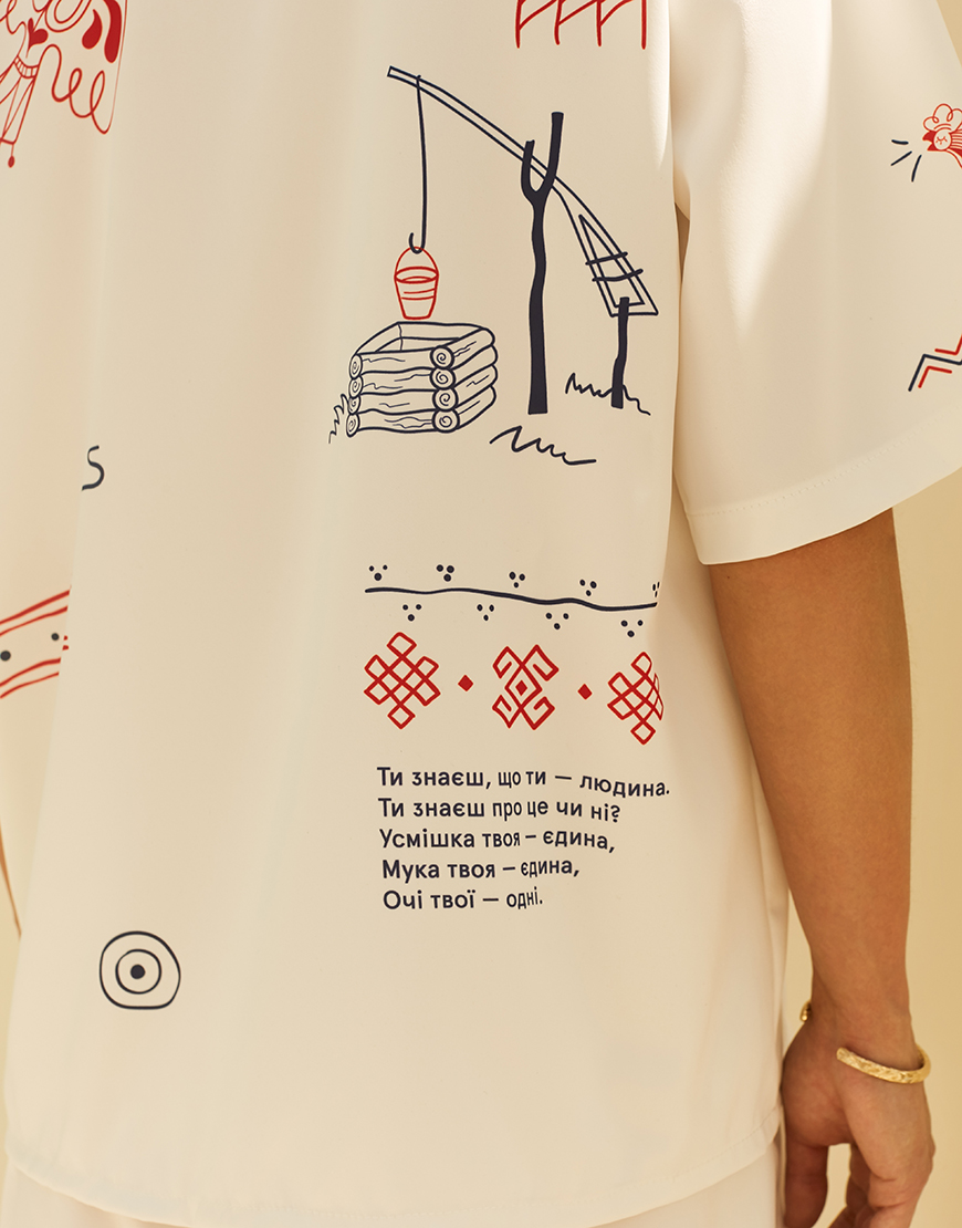 Доставка впродовж 1-2 робочих днівСорочка “Трипілля” вільного крою. Виготовлена із ніжного сатину у молочному кольорі. Декорований авторськими орнаментами, натхненними символікою трипільської культури. Ідеальний для літа — комфортний, стильний і з українським характером.