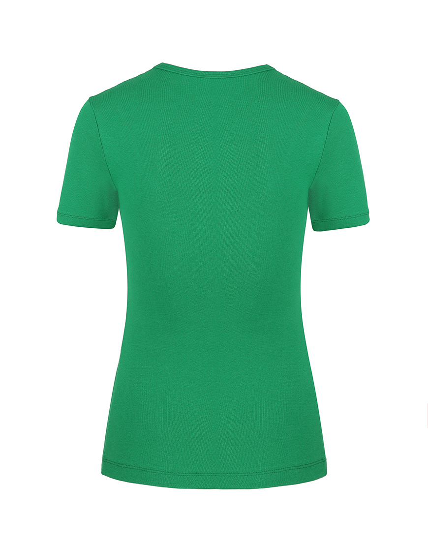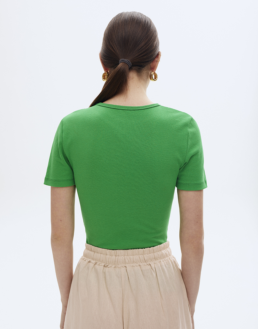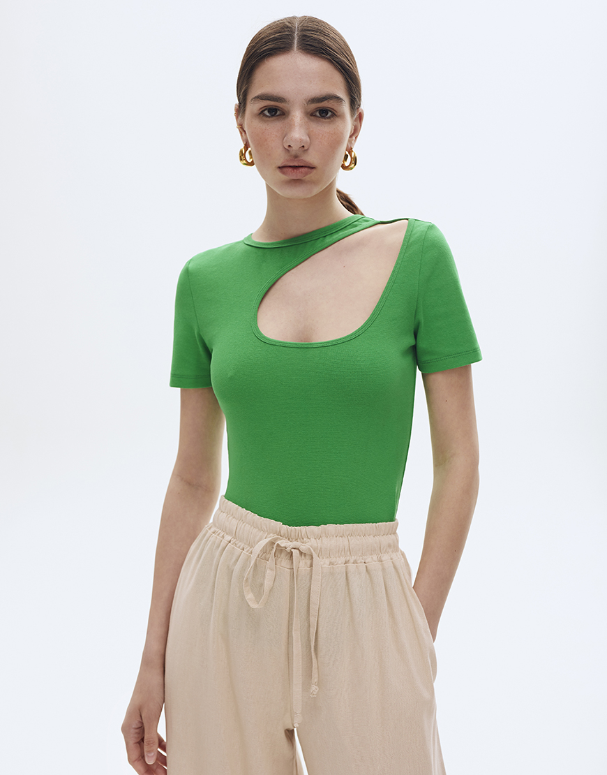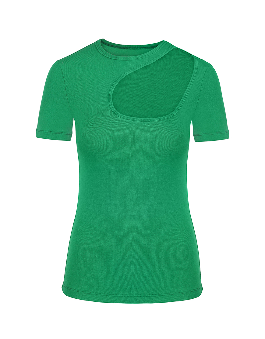Доставка впродовж 1-2 робочих днівСтильна базова футболка з акцентним асиметричним вирізом, який додає образу сучасності та сміливості. М’який еластичний трикотаж комфортно прилягає до тіла. Ідеально поєднується з джинсами, шортами чи жакетом. Доступна в білому, чорному та зеленому кольорах.