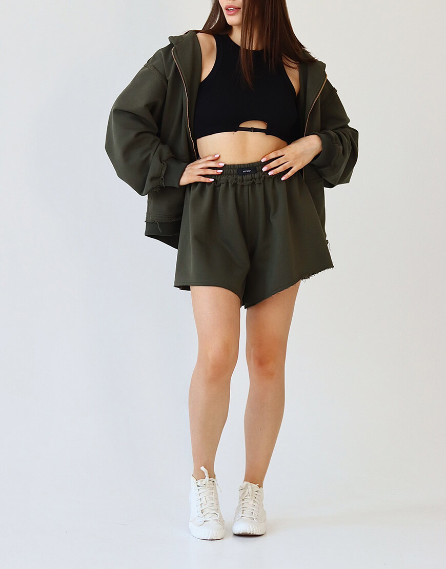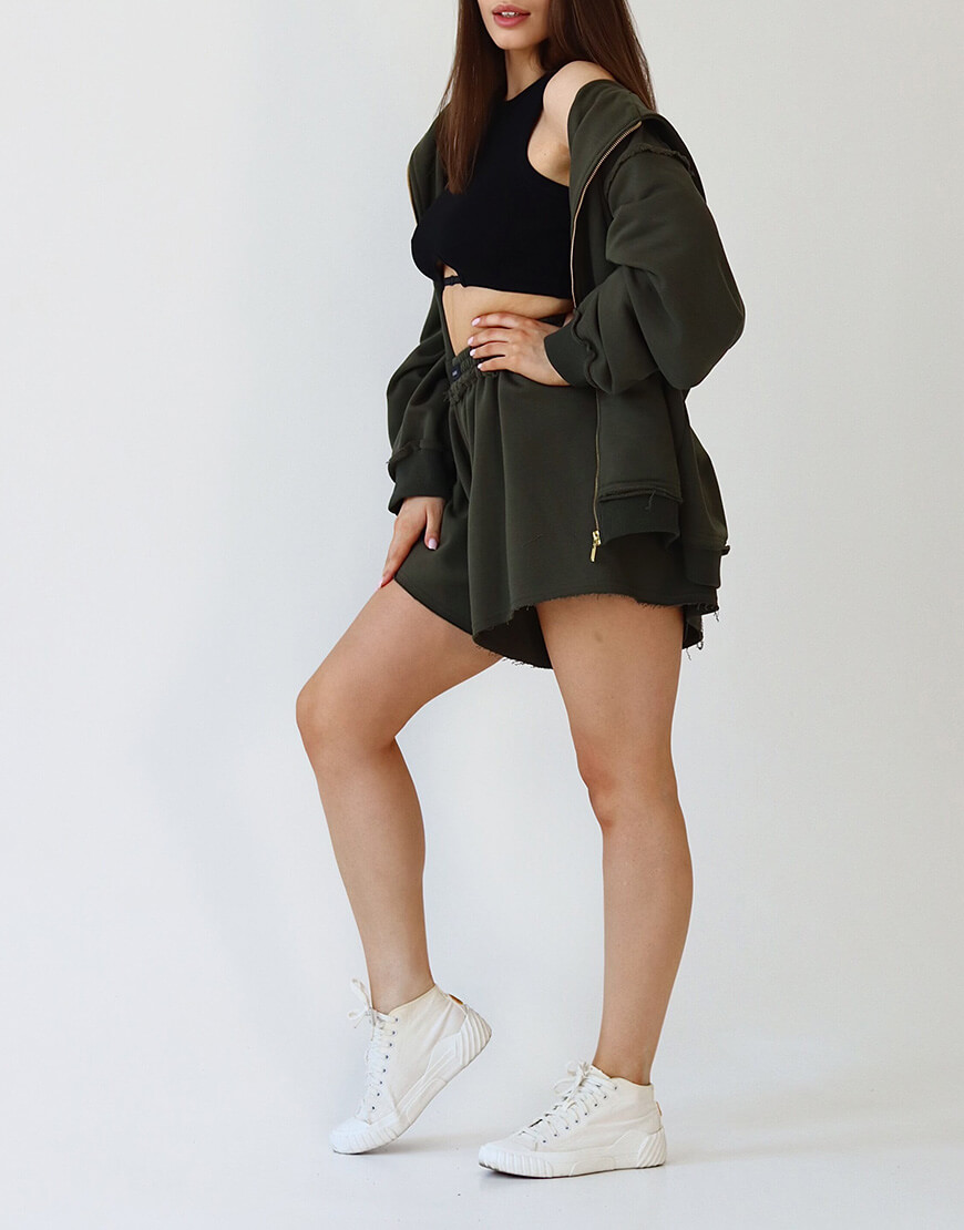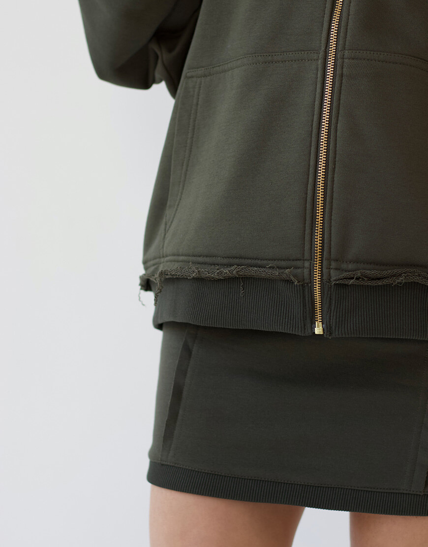 Зіп-худі зі швами назовніу фасоні oversize – це супер базова річ. Зіпе-худі можна носити з шортами чи спідницями, а в прохолодну пору року – з джинсами або легінсами. Ви можете утворити костюм, обравши штани цього ж самого кольору.