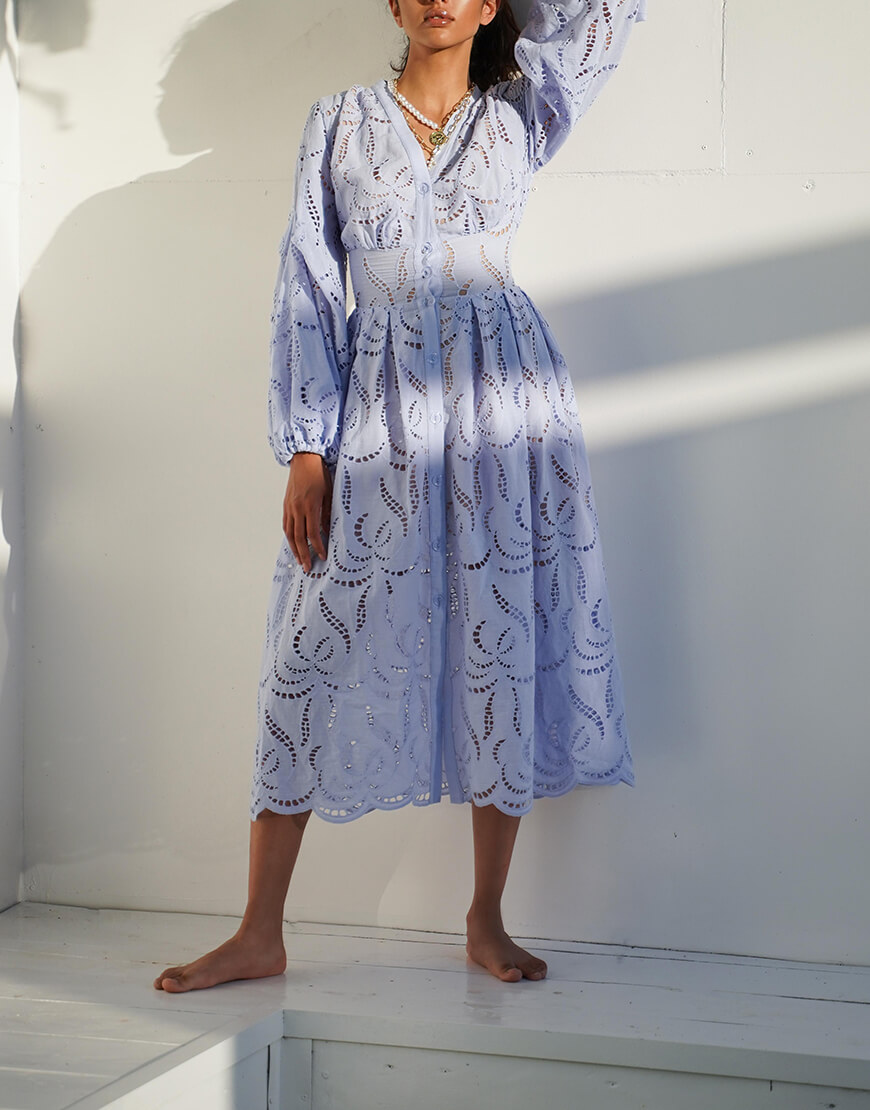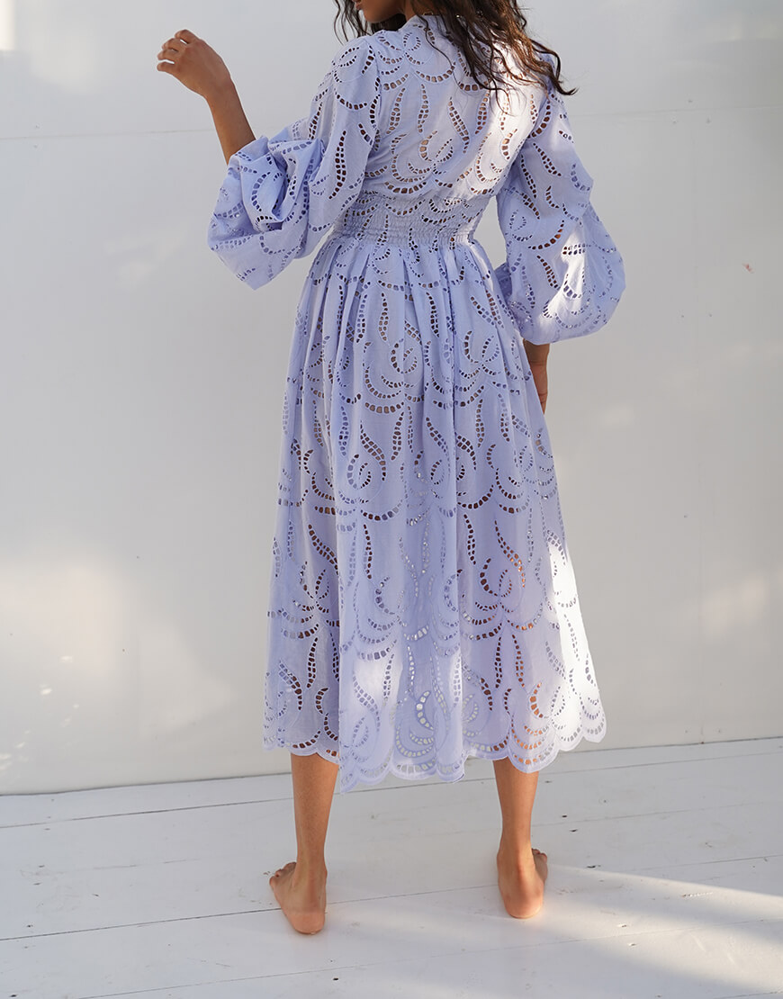 Розкішна сукня з бавовняної тканини з вишивкою. Об’ємні рукави та спідниця. Талія підкреслена гумкою по спинці сукні. Виконано на підкладці. Застібається спереду на ґудзики.