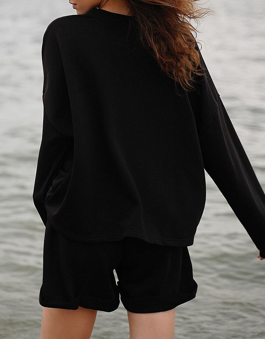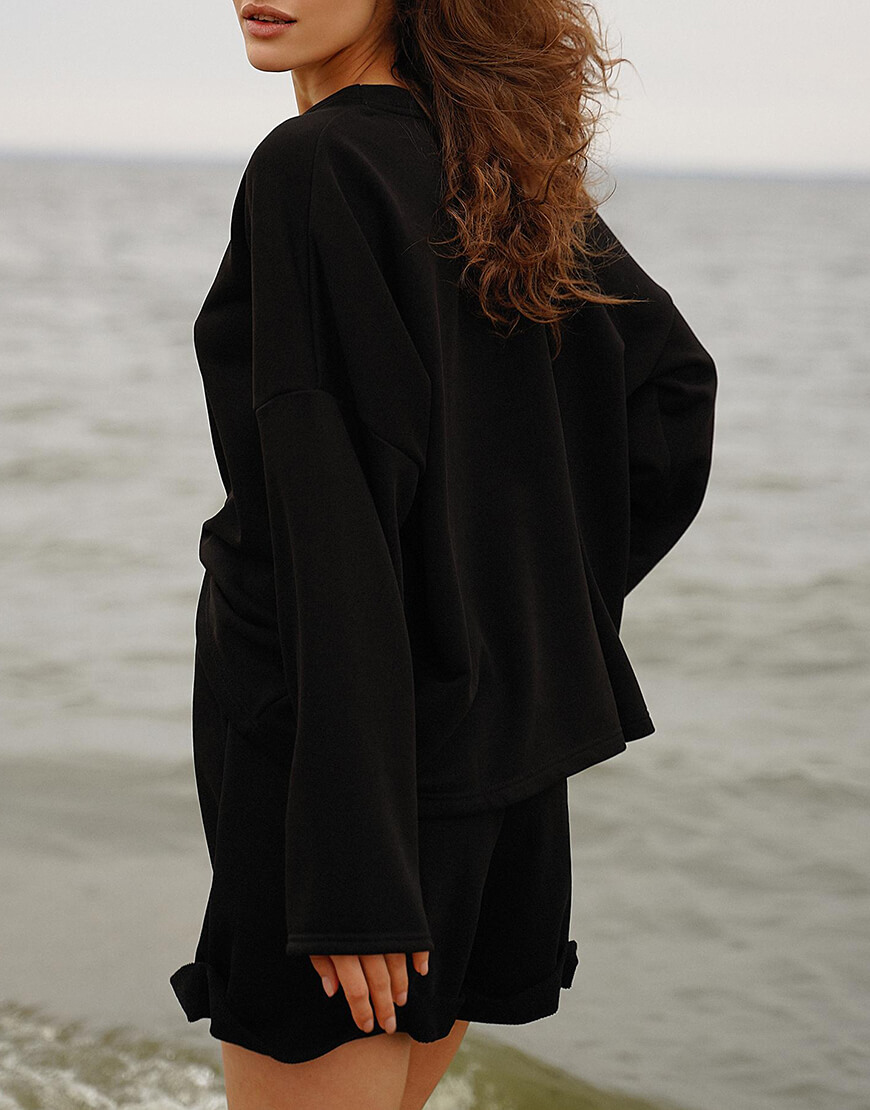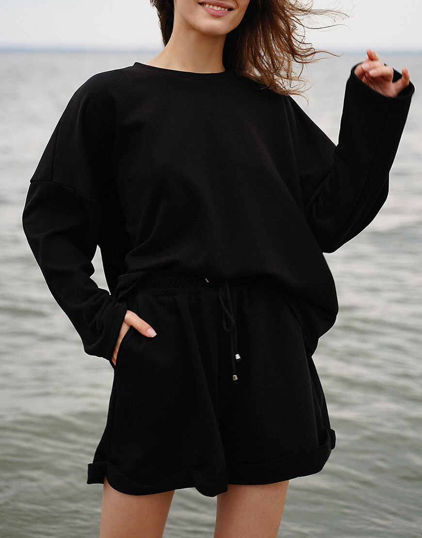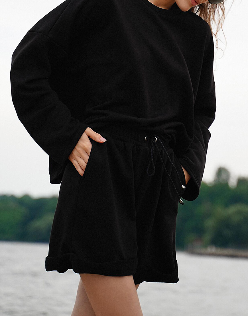 Повсякденний бавовняний костюм. Об’ємний світшот зі спущеною лінією плеча і шорти з високою талією та кишенями з боків. Суміжні розміри: XS/S, M/L