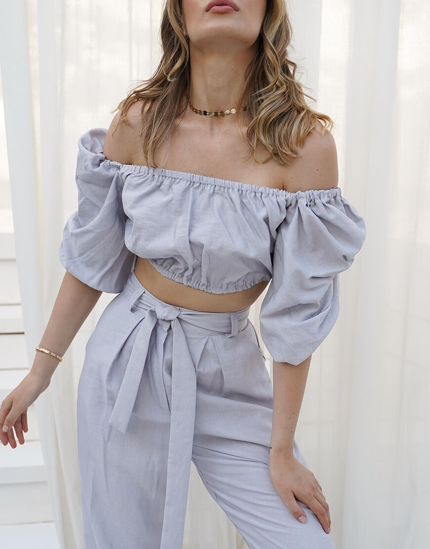 Лляний костюм складається з топа і широких штанів. Штани з високою лінією талії застібаються спереду на потаємну блискавку і гачок. Топ з об’ємними рукавами з гумкою по всьому об’єму ліфа.