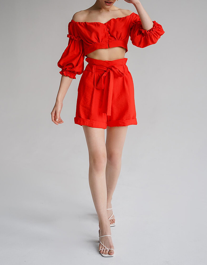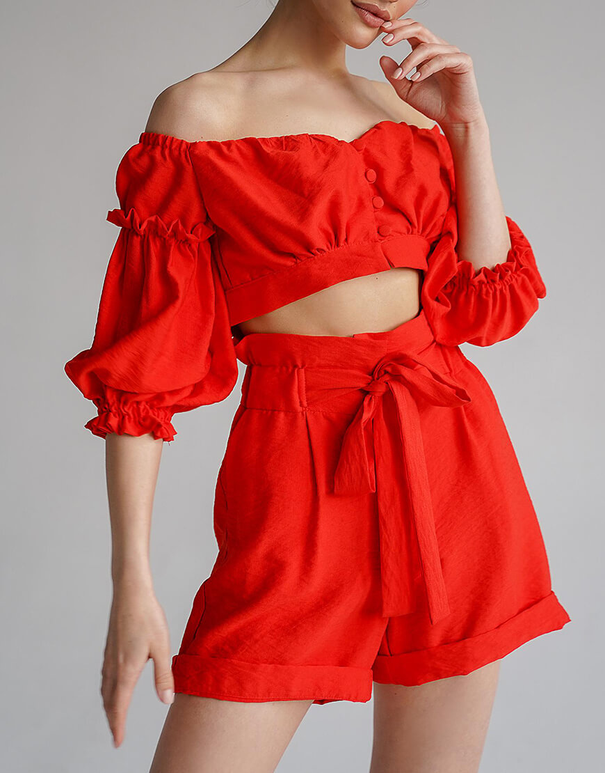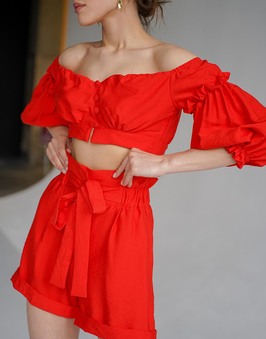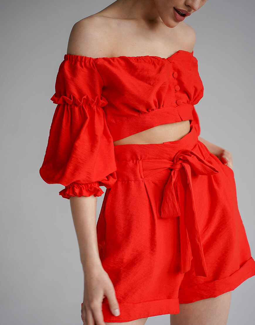 Ніжний, літній костюм з легкого, прохолодного льону. Топ з об’ємними рукавами застібається спереду на красиві ґудзики. Шорти вільного крою з високою талією і кишенями з боків.