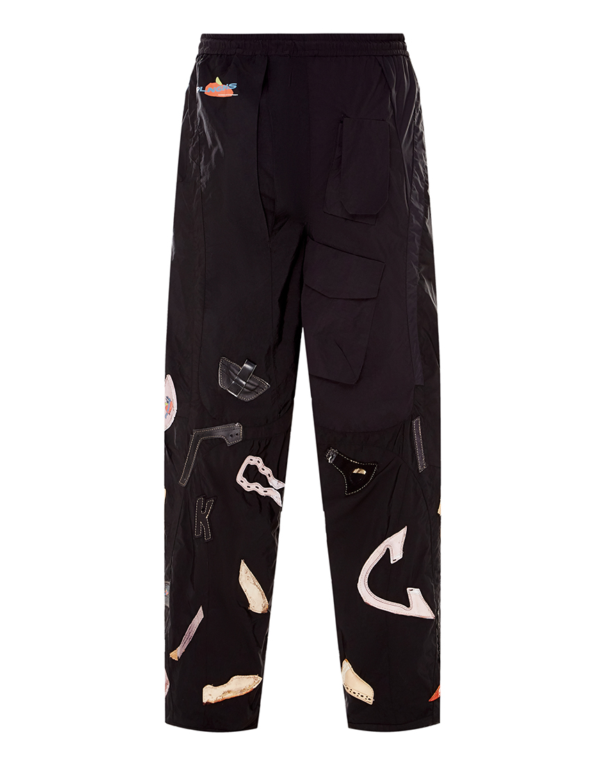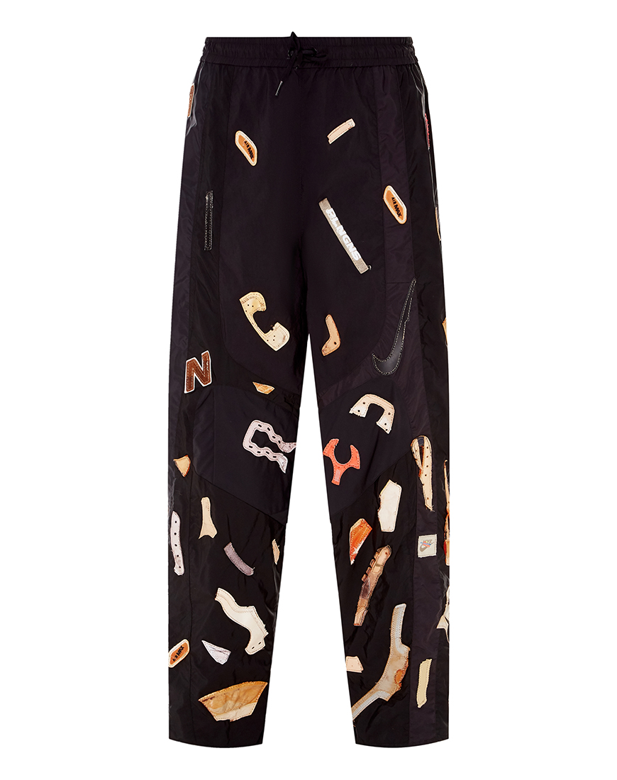 Ці унікальні унісекс-штани створені з нейлону, отриманого шляхом деконструкції та переробки нейлонових секонд-хенд курток. Чорна база з oversize-силуетом та еластичним поясом на талії доповнена численними аплікаціями з дрібних деталей перероблених кросівок: логотипів, елементів верху та фурнітури. Це поєднання створює характерний хаотичний та урбаністичний дизайн.