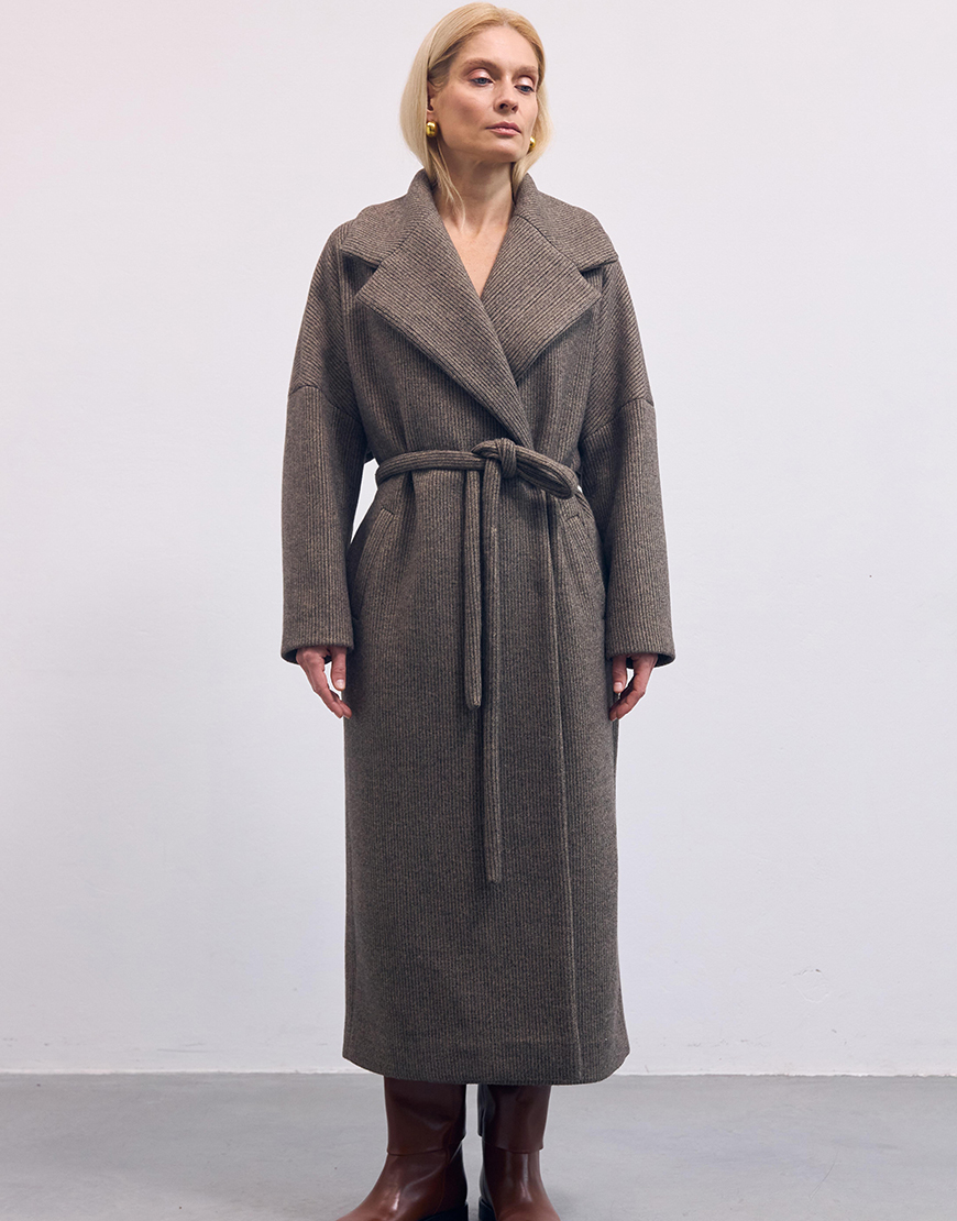 Пальто вільного силуету , з спущеним плечем . Застібка на кнопки . Є пояс .