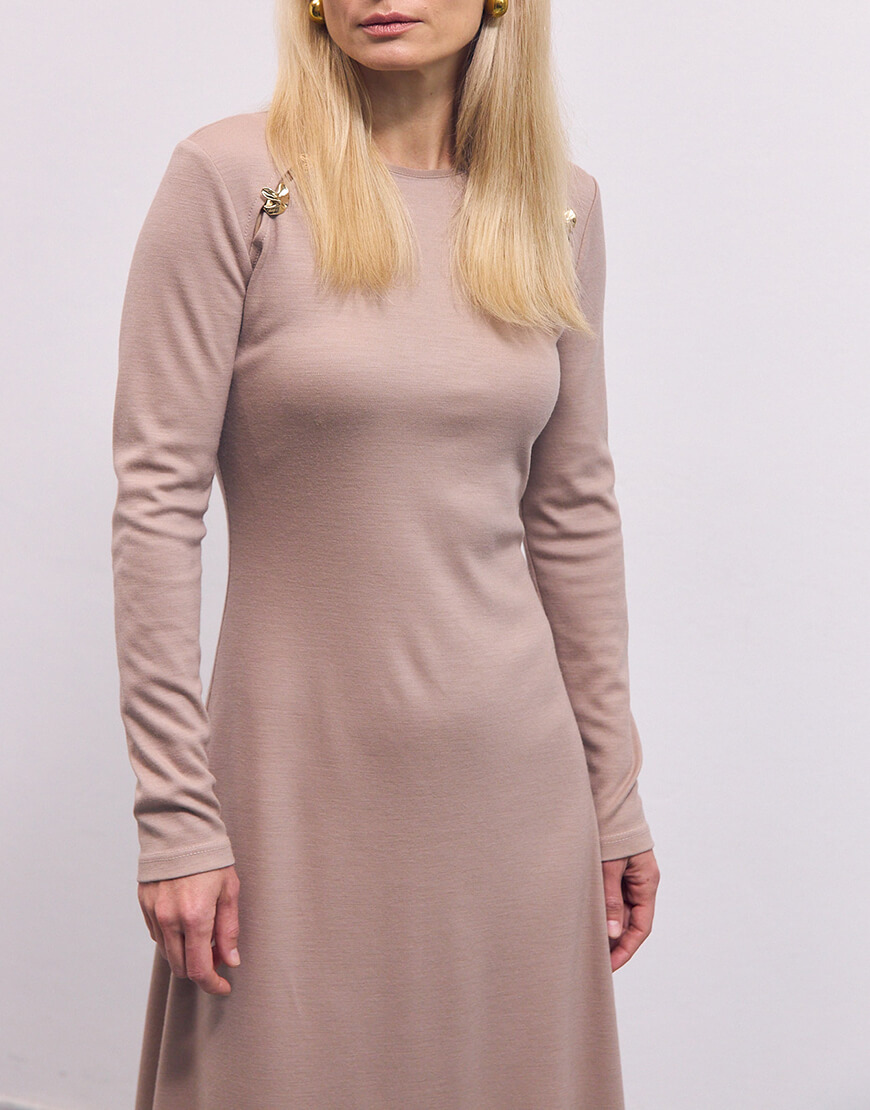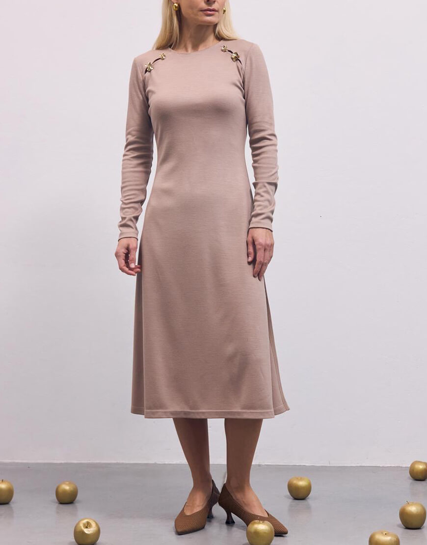 Сукня прилягаючого силуету , з трапецивидним розширенням до низу . На пілочці присутні декоративні розрізи , оздоблені декоративними ґудзиками. Застібка , потайна блискавка на спині.